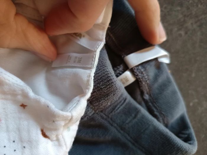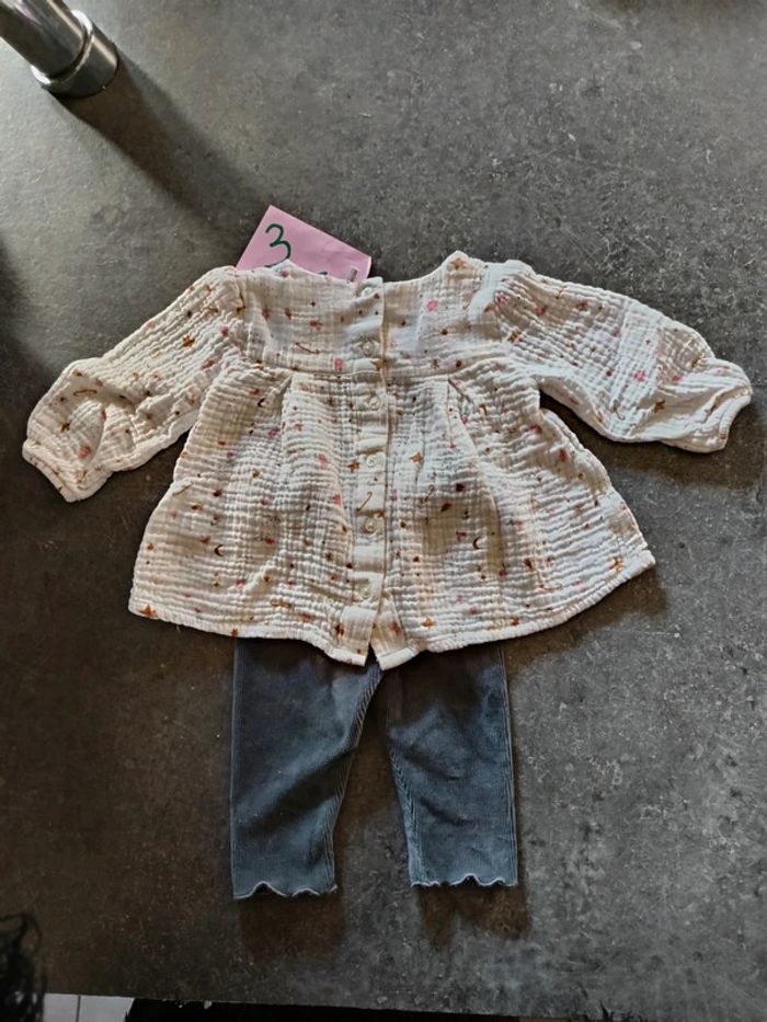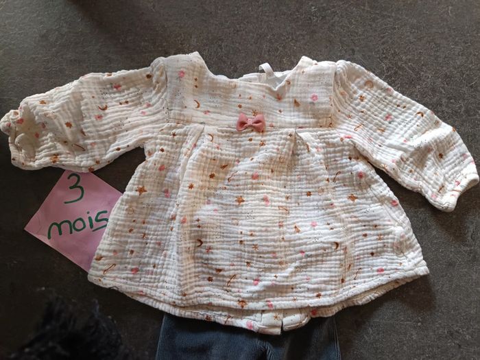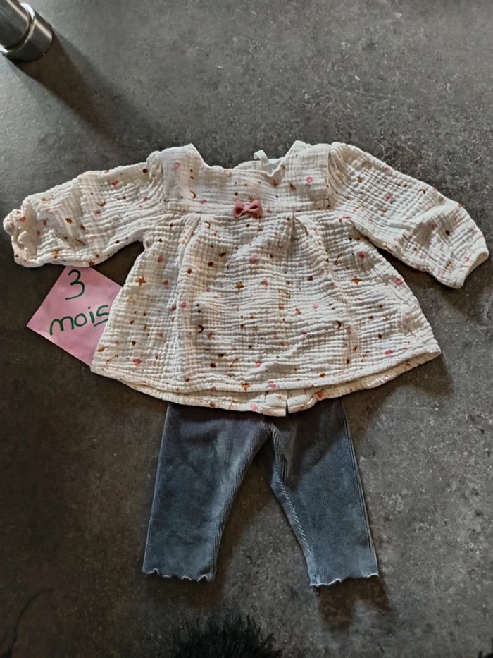 Ensemble 2 pièces : - 1 haut rose clair en gaze de coton - 1 pantalon gris en velours, Très bon état, peu porté ! Taille 3 mois #vetementbebefille3moisjustine182129