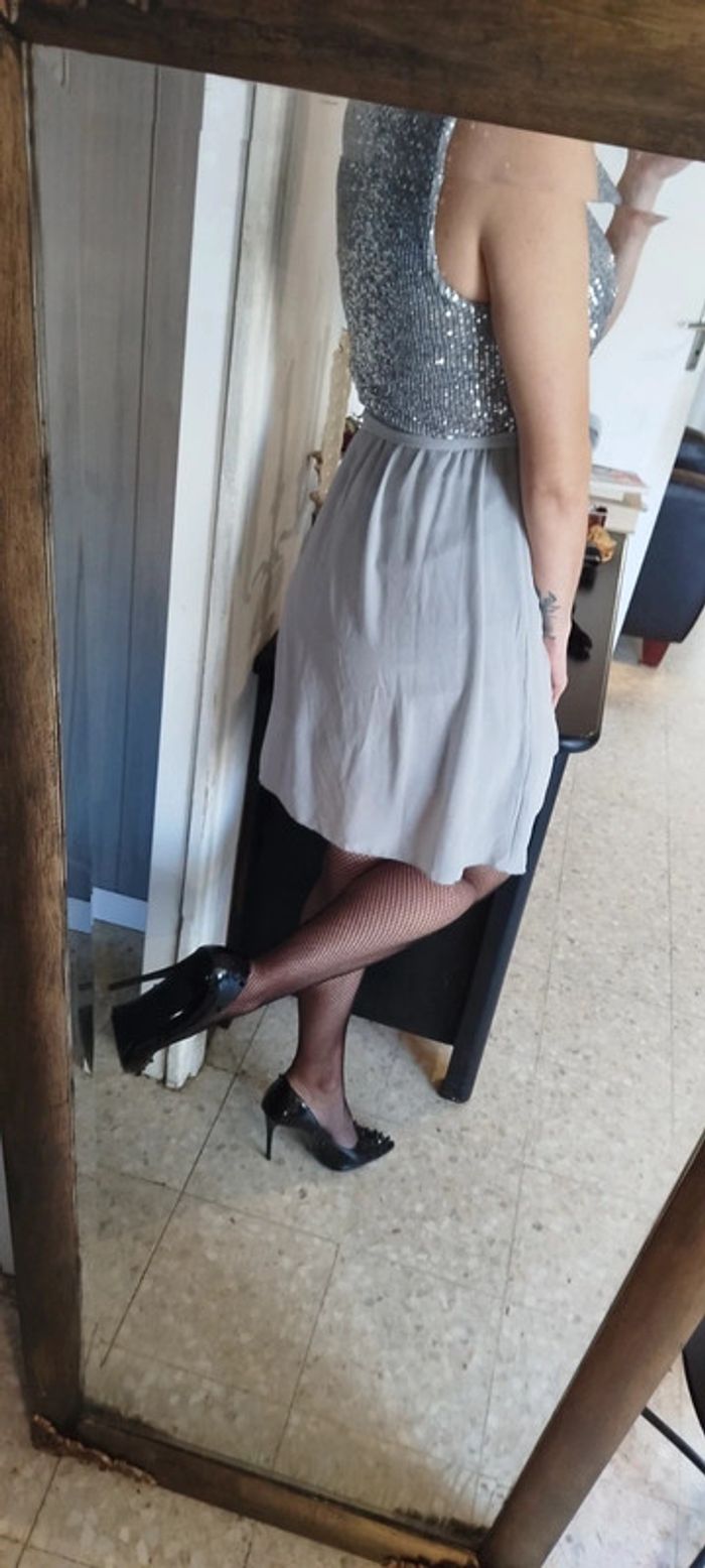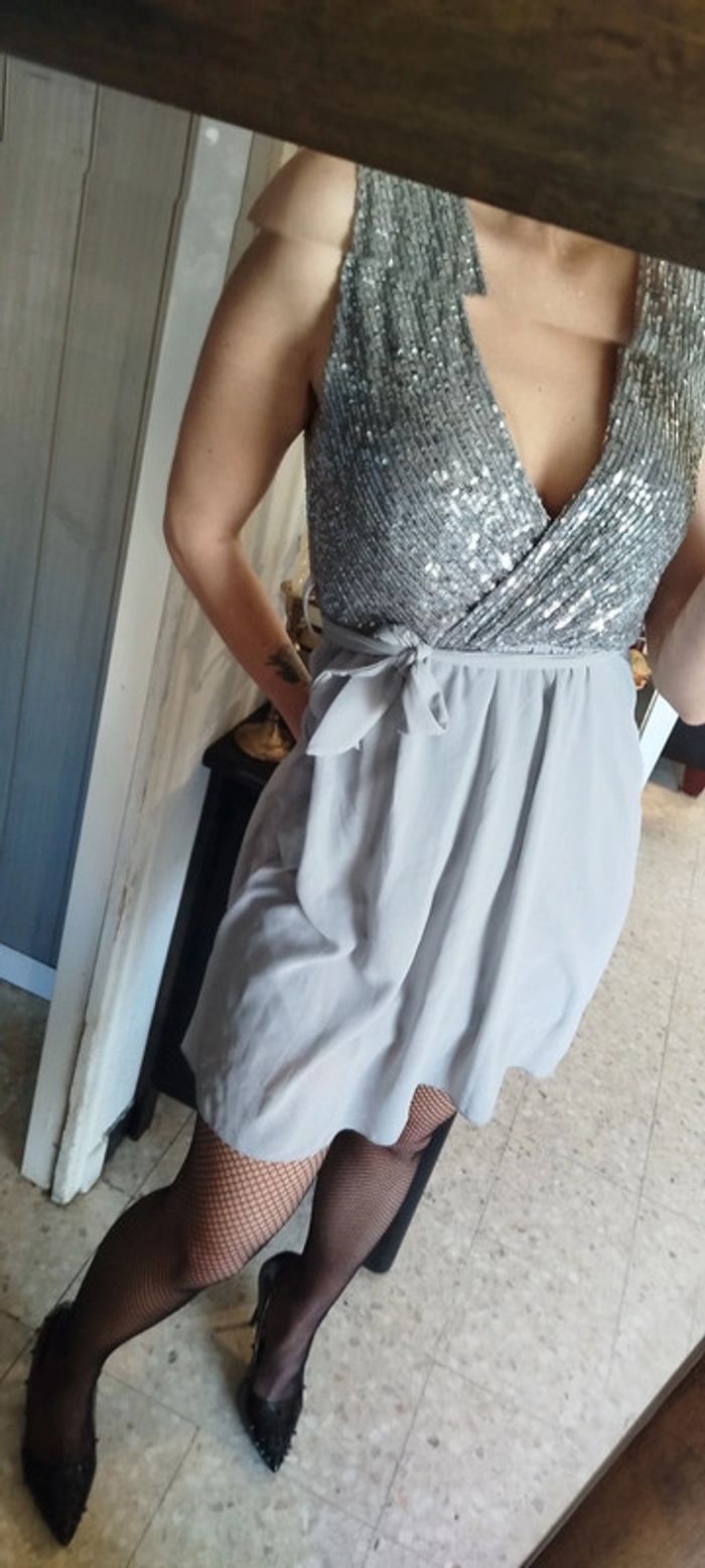 Robe élégante bicolore avec un haut en sequins argentés et une jupe fluide grise. Décolleté en V croisé, ceinture à nouer à la taille. Idéale pour une soirée ou un événement spécial. Très bon état mise une fois