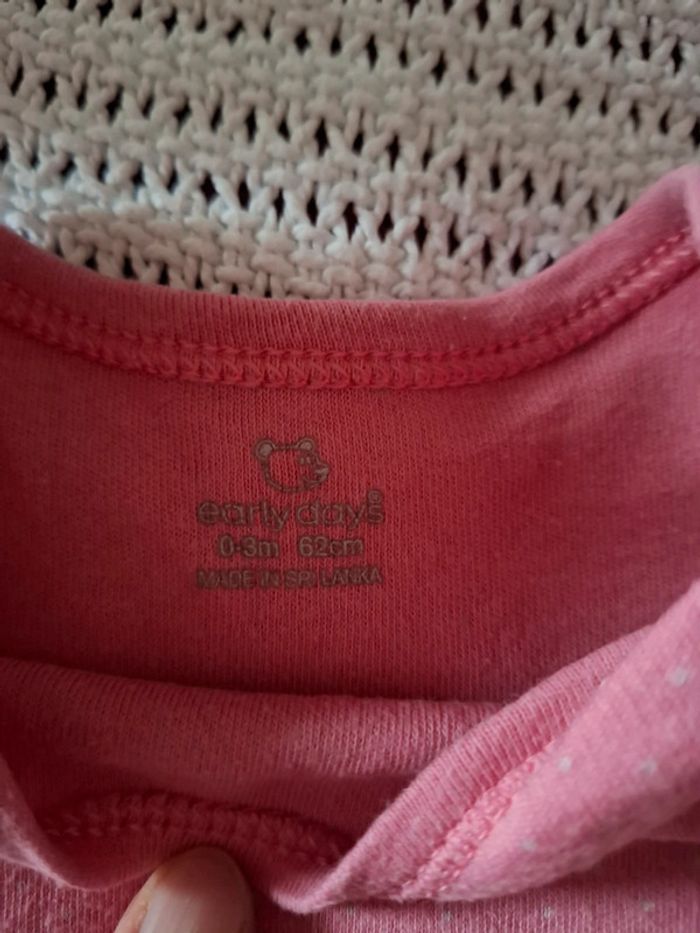 Porté ,reste en bon etat Rose avec des points blanc(c'est pas des taches) mais ce voit pas beaucoup ...(Voir photos) 0-3 Mois : 62cm sur étiquette Pas de tâches apparentes ni trous... #voehele66vetements3-6mois
