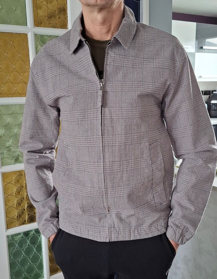 blouson BIZZBEE à carreaux gris et beige, taille M, très bon état