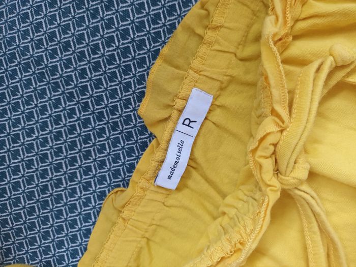Top jaune d'été à porter avec ou sans les bretelles car il y a un élastique. Marque : Mademoiselle R Taille : M 100% coton Largeur de l'élastique à plat : 38 cm Longueur sans les bretelles : 43 cm Très bon état