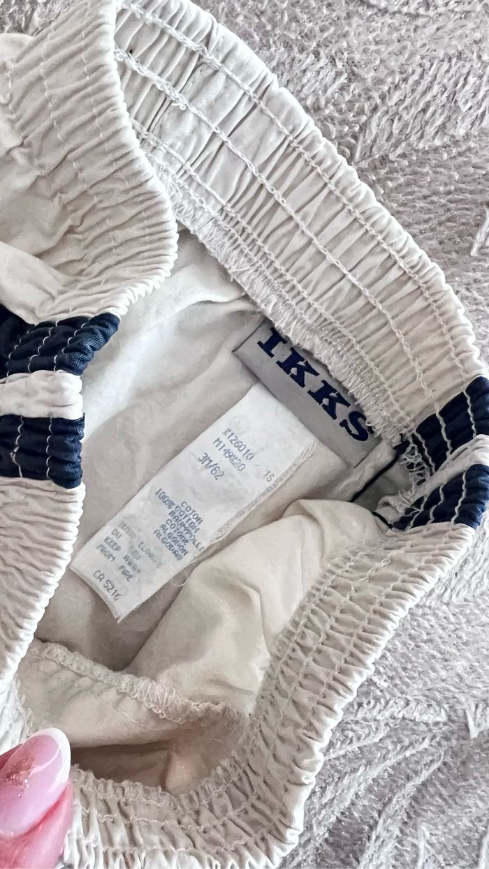 Short IKKS bébé 3 mois 62 cm 100 % coton Taille élastique Coloris blanc, bleu marine, rouge Ce n'est pas un blanc clair mais plutôt foncé Une poche à scratch sur le côté Maison non fumeur et sans animaux 📩Je réponds rapidement aux messages 📦Envoi rapide et soigné