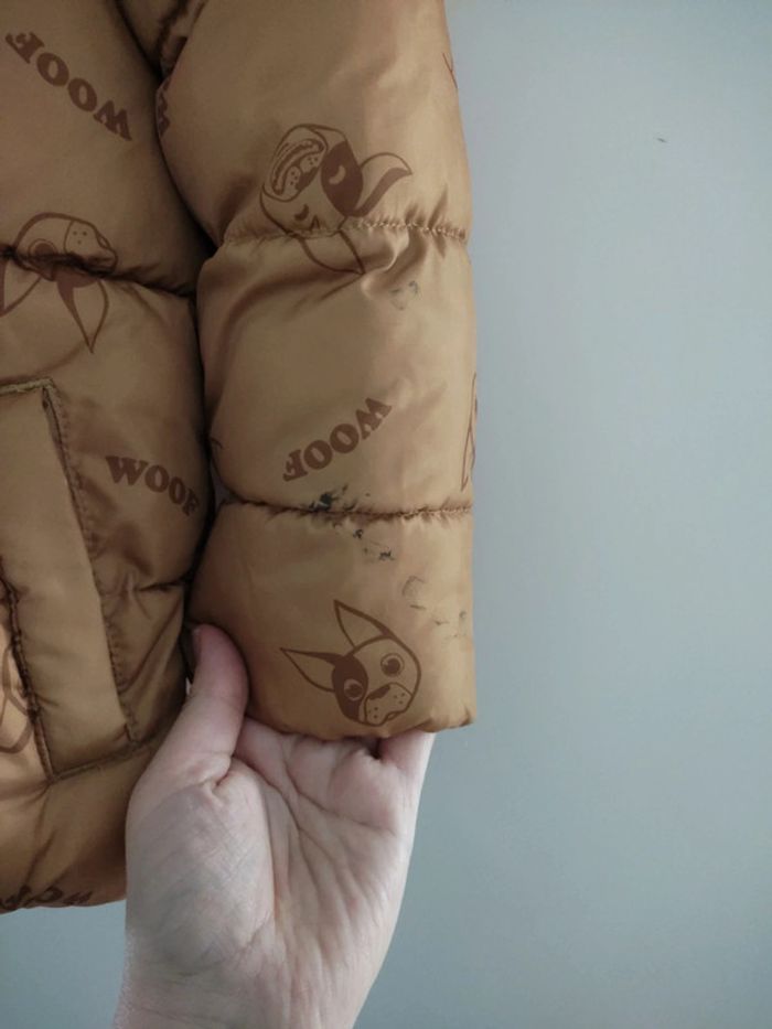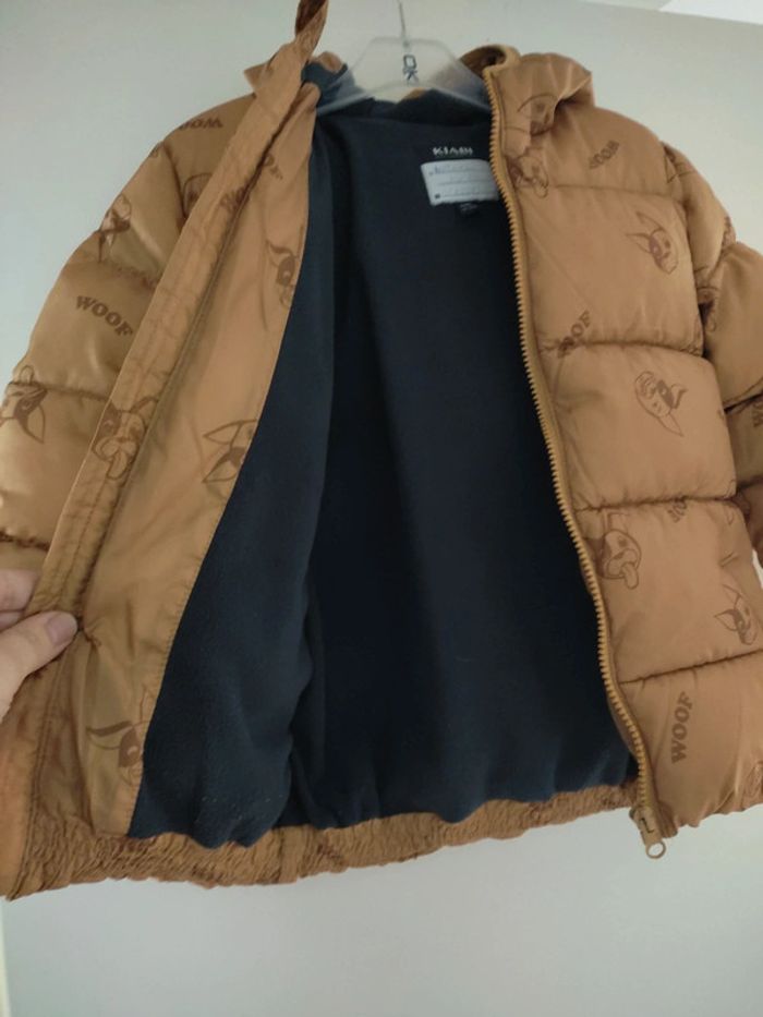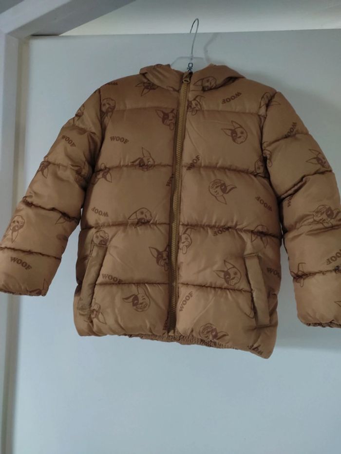 Blouson doudoune manteau doublé polaire bien chaud de la marque Kiabi taille 6 ans. Motif petit chien. Attention voir photos tâche de graisse noire sur la manche gauche d'où le petit prix.