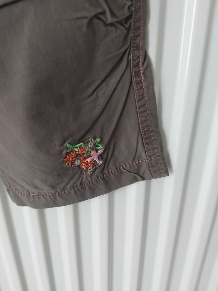 Pantalon léger. Couleur kaki très clair et liseré orange motif petite fleur en bas du pantalon. Deux petites poches sur le devant. Marque pommette. En très bon état. #fille18moisnade3033