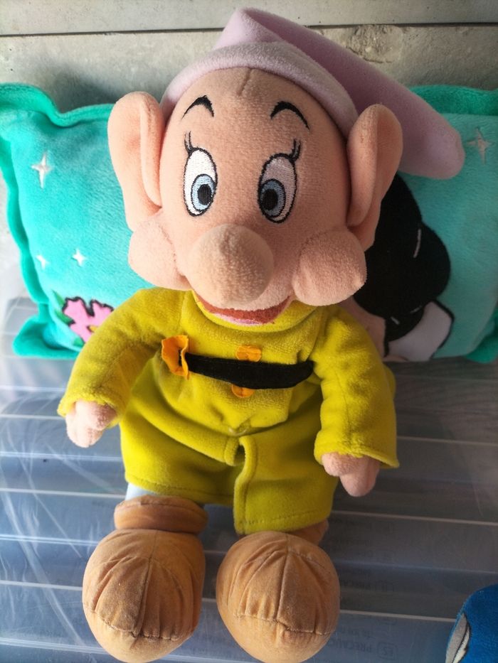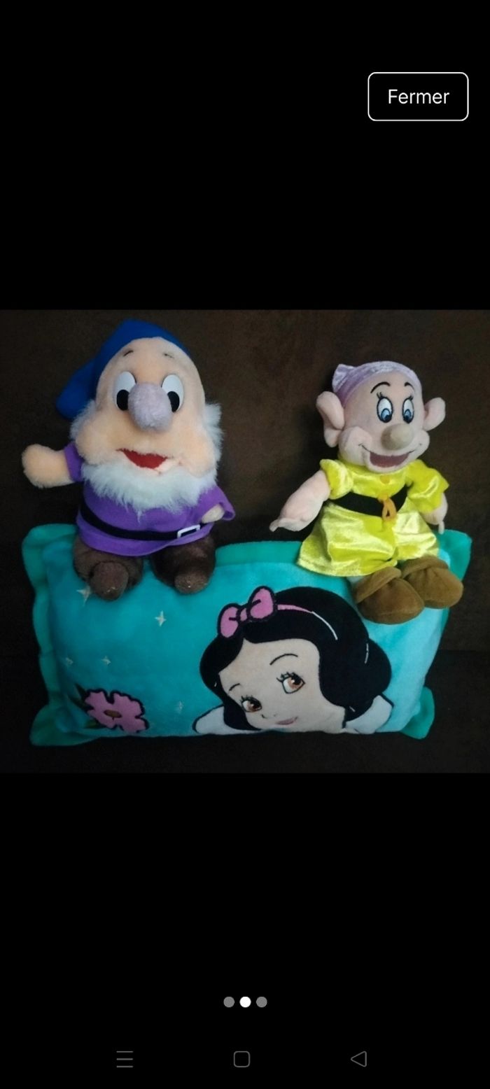 Lot blanche neige et les 7 nains Coussin largueur 41 cm , hauteur 26 cm Grand simplet 40 cm Petit 25 cm Le petit 22 cm 1 cœur grincheux Le tout très bon état 15€