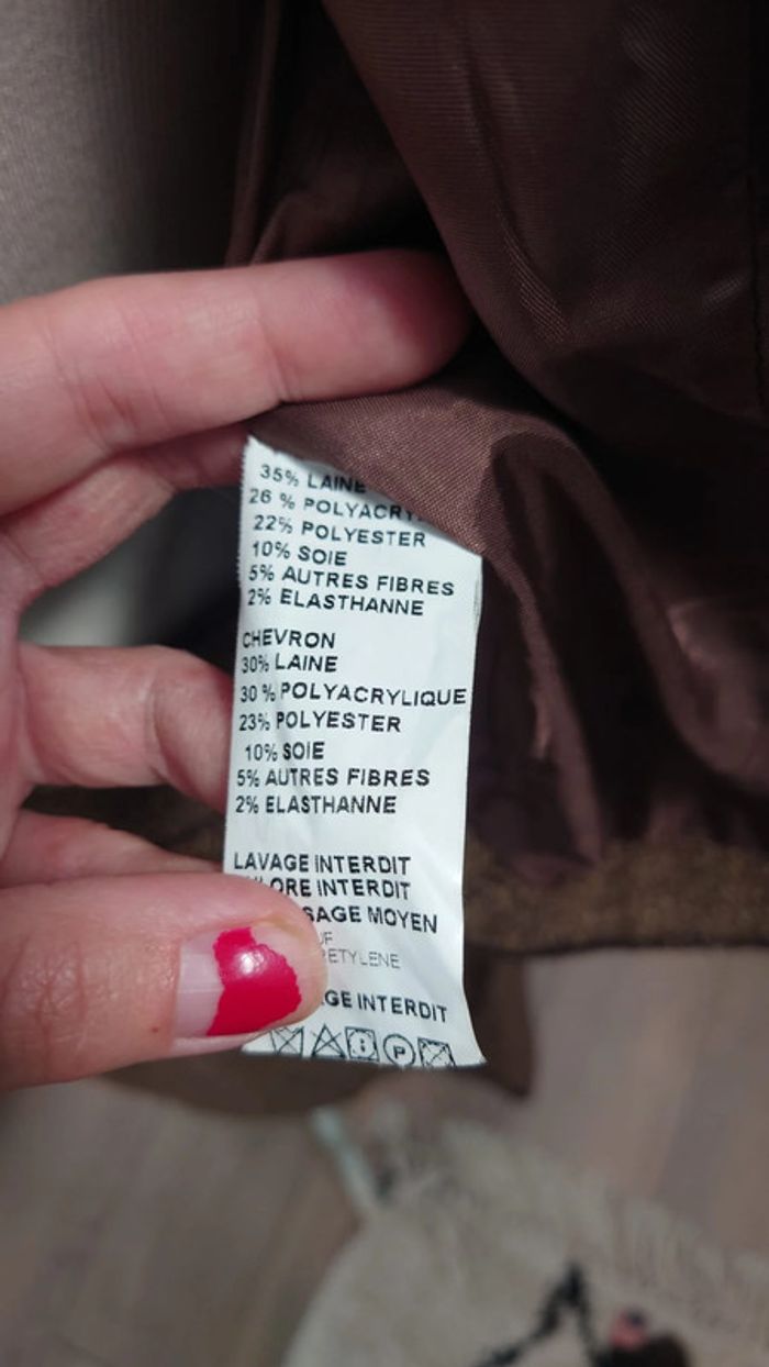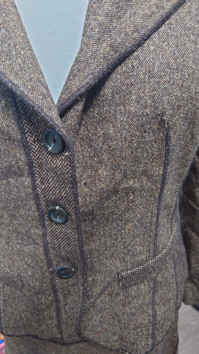 Tres peu porté, comme neuf 35 % laine - 26 % polyamide - 22 % polyester - 10 % soie - 5 % autres fibres - 2 % elasthane style tailleur tweed années 40 50