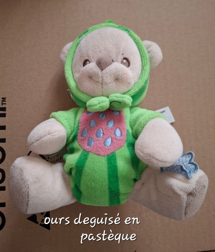 Doudou ourson déguisé en pasteque 13cm.avec grelot