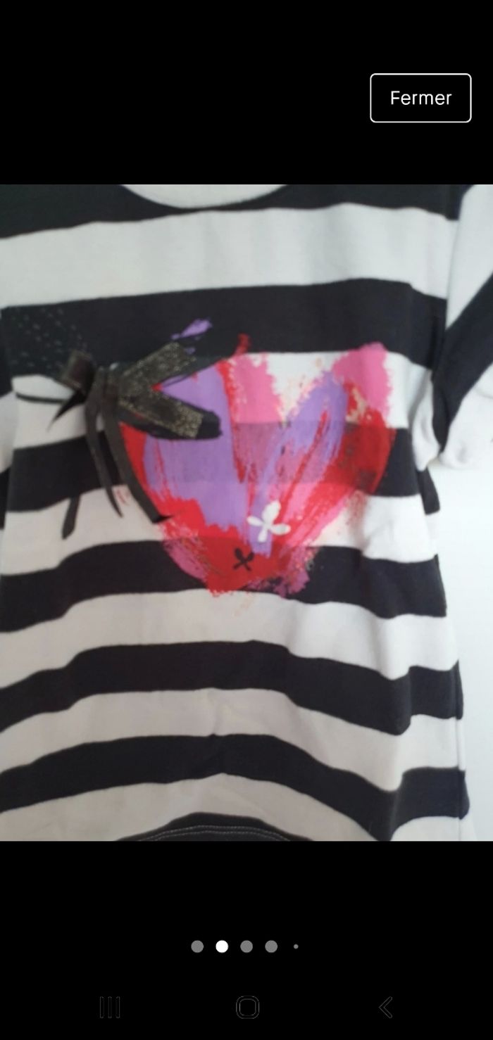 Tee-shirt a rayures noires. Coeurs rouge, rose et violet. Petit noeud a côté du coeur. Manches bouffantes 4 ans catimini.