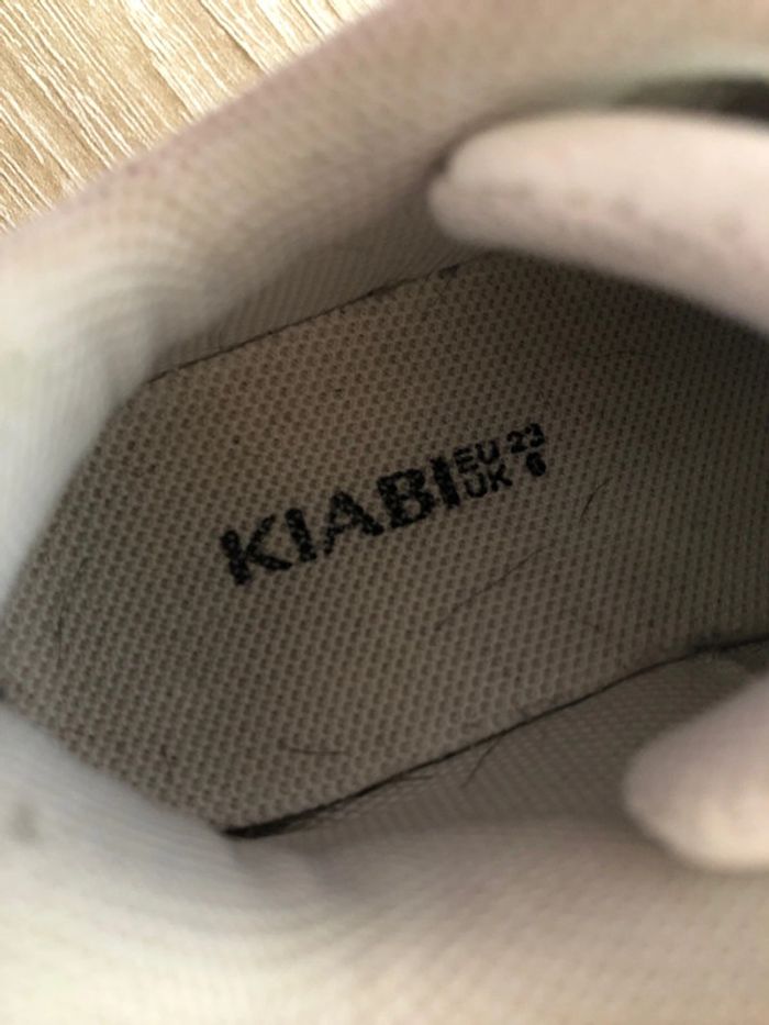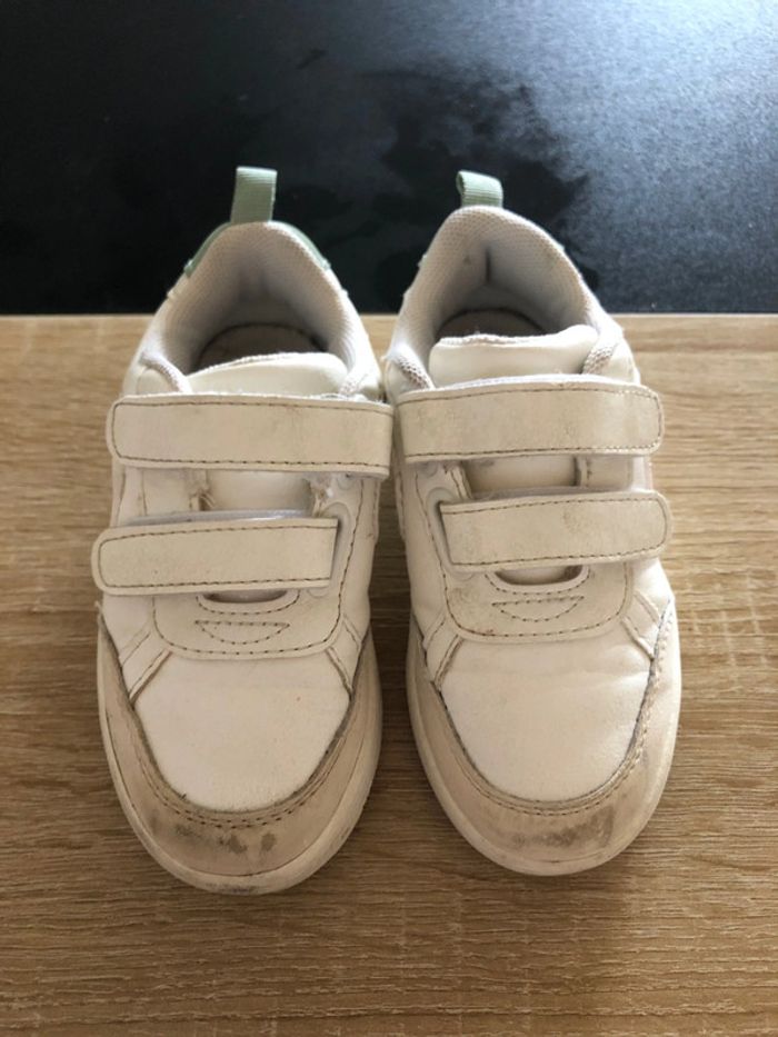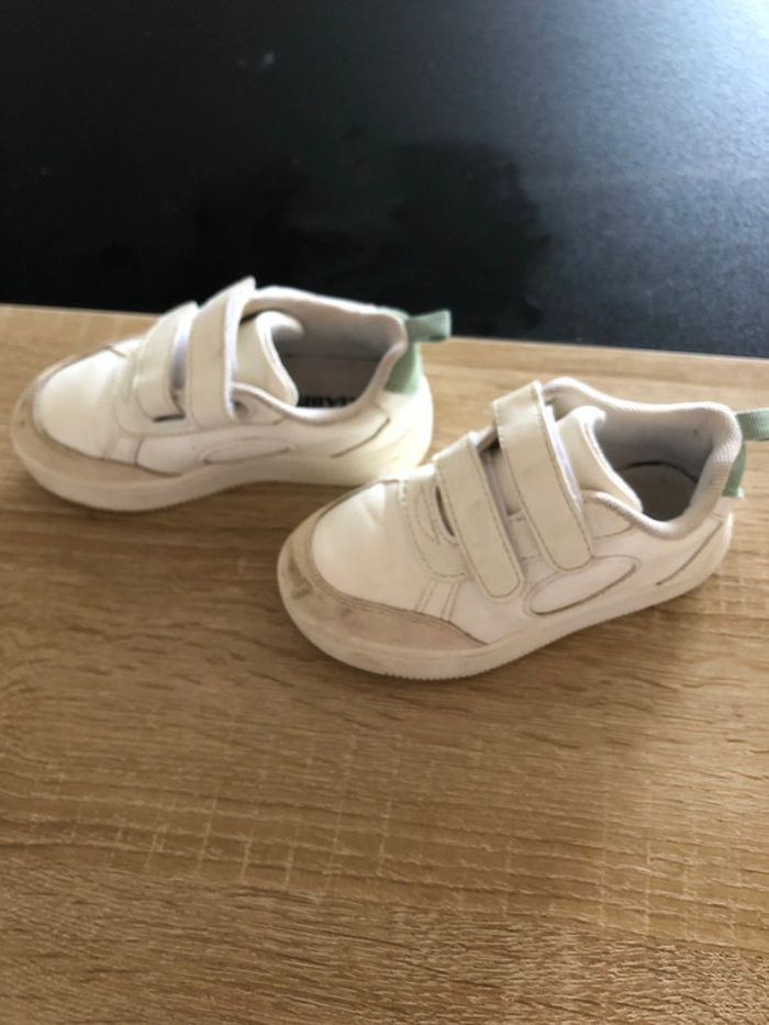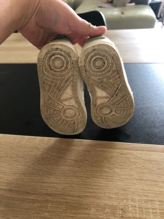 👧🏼👦🏻basket à scratch 📏23 ◾️kiabi 🎨blanche et bleu vert ⚠️7 et 8 photo a regarde
