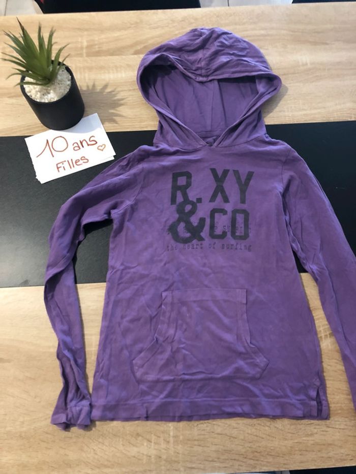 👧🏼t-shirt fille manche long à capuche 🎨violet ◾️roxy 📏10 ans ⚠️ voir photo 4 petit tache 🚚Envoi le mardi et jeudi ou vendredi 📦 🛍️Possible de faire des lots 👩🏼femme 32 au 44 👦🏻👧🏼enfant fille et garçon de 0a 16 ans 👨🏻homme