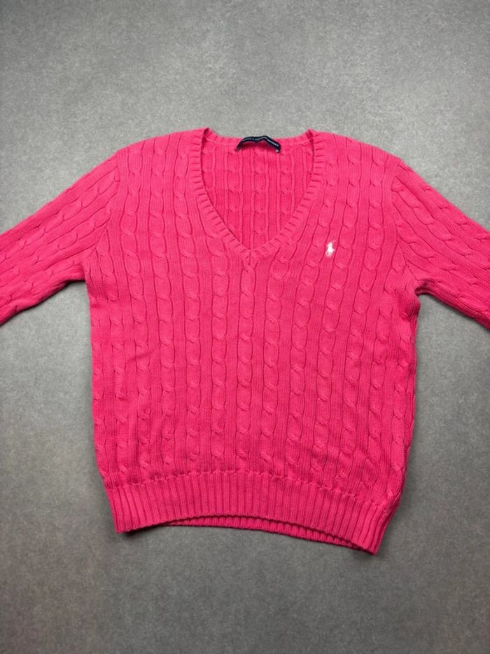 Pull d’hiver torsadé en maille Ralph Lauren rose logo blanc col V taille L femme - photo numéro 1