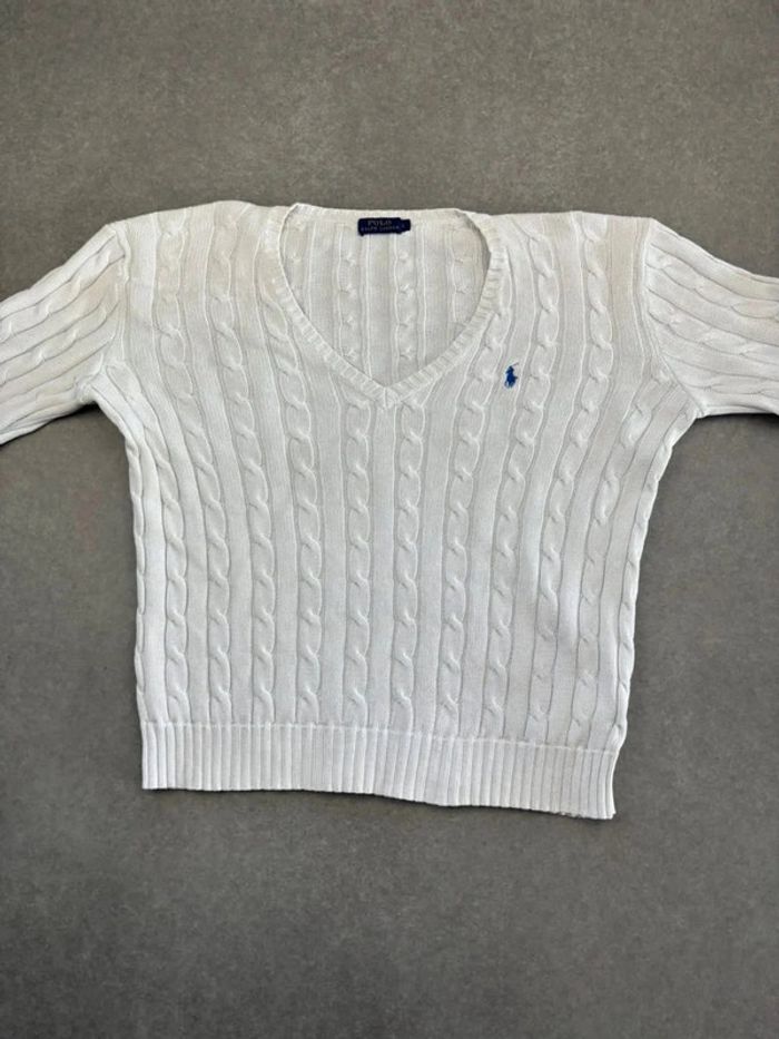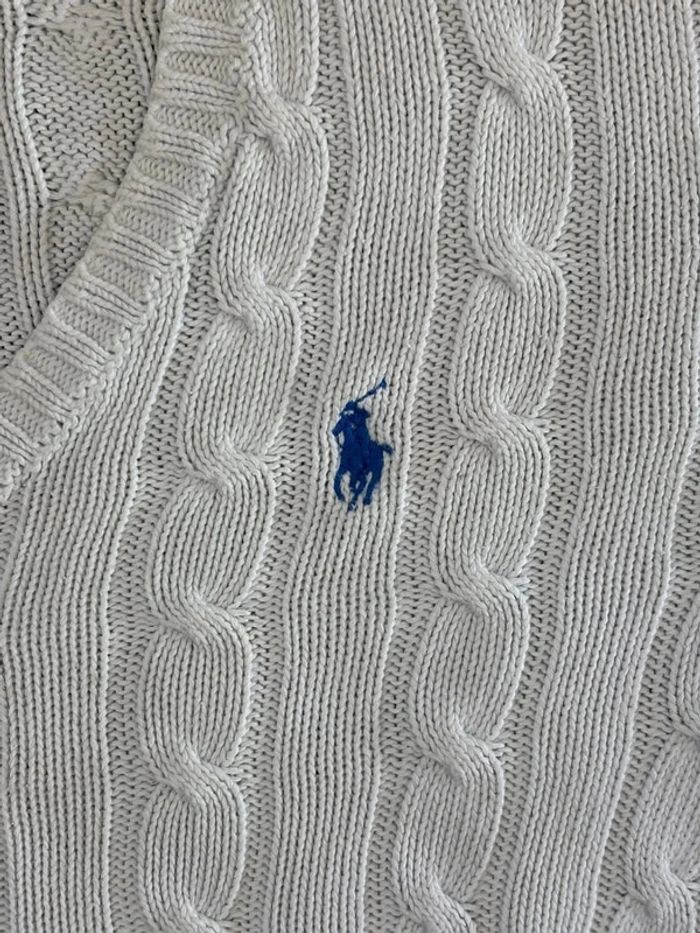Pull d’hiver torsadé en maille Ralph Lauren blanc logo bleu col V taille L femme - photo numéro 1
