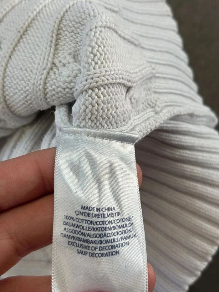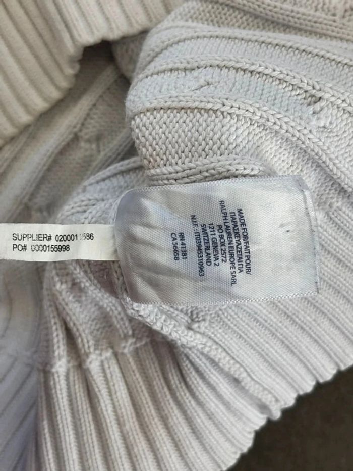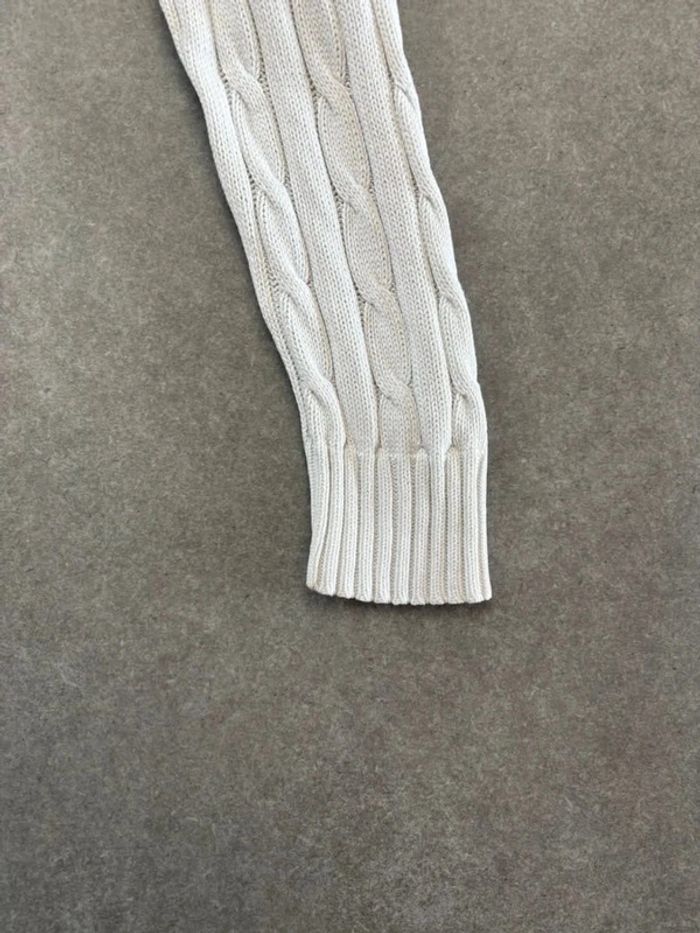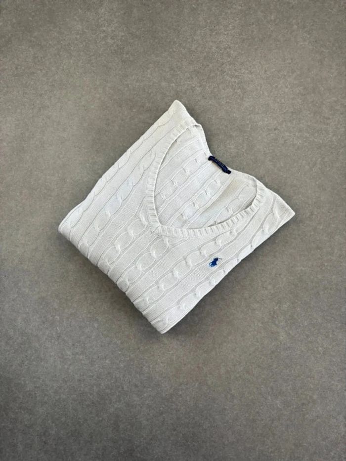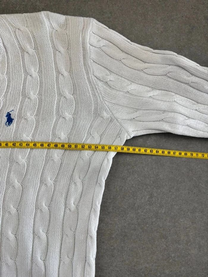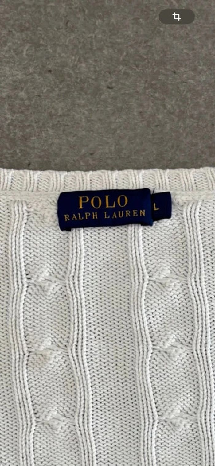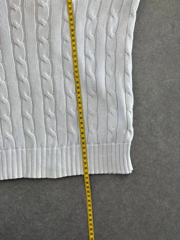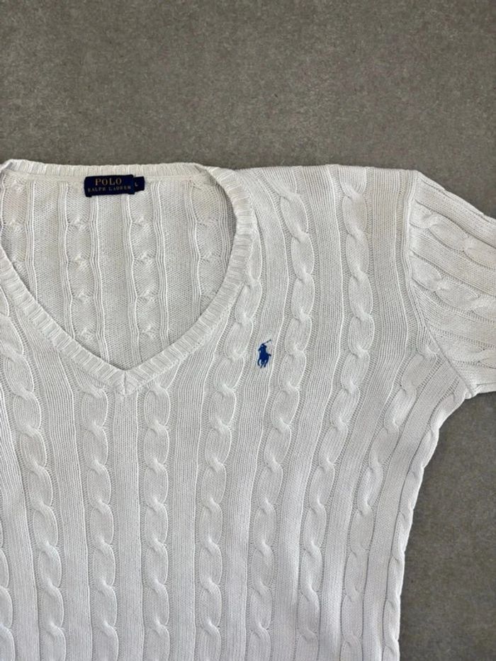 Pull d’hiver torsadé en maille Ralph Lauren blanc logo bleu col V taille L femme - photo numéro 11