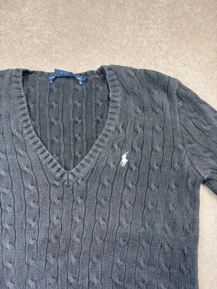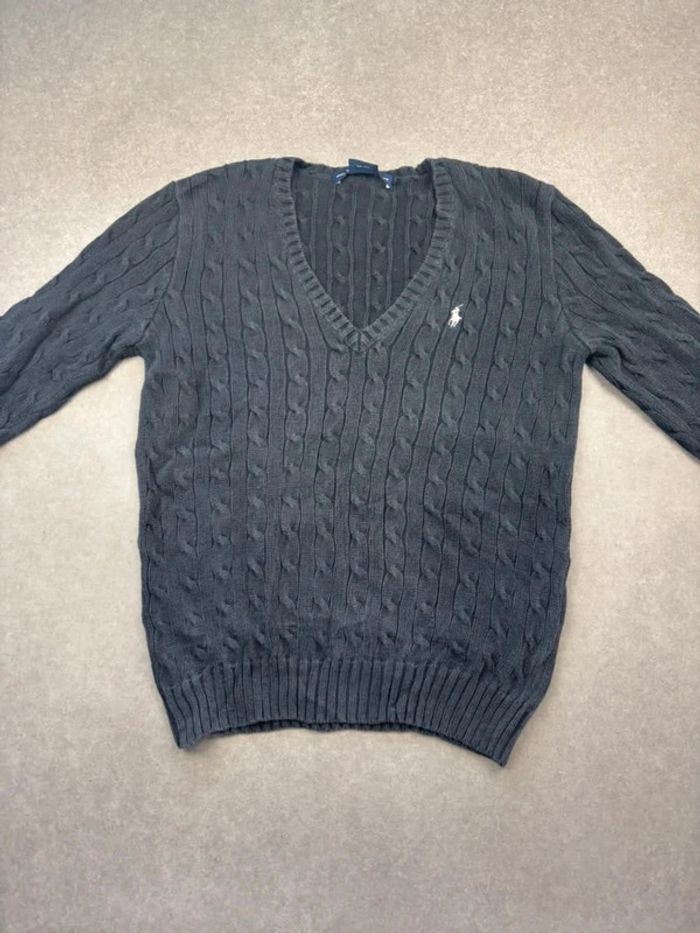Pull d’hiver torsadé en maille Ralph Lauren noir logo blanc col V taille L femme - photo numéro 1