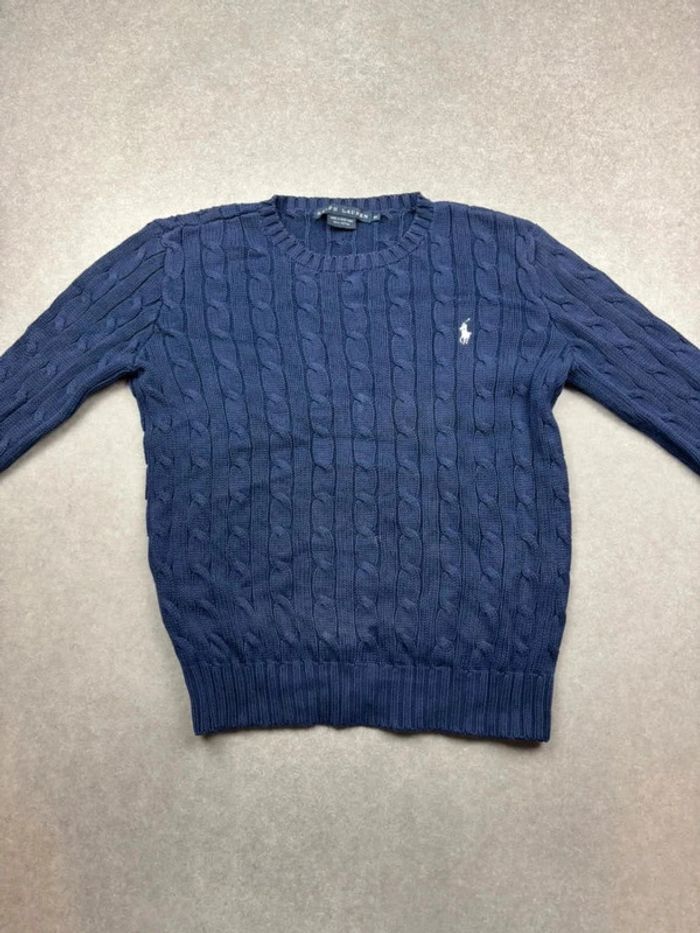 Pull d’hiver torsadé en maille Ralph Lauren bleu marine logo blanc col rond taille XS - photo numéro 1