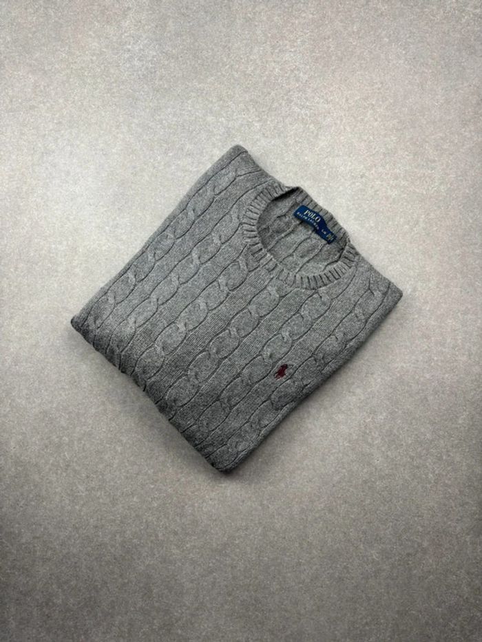 Pull d’hiver torsadé en maille Ralph Lauren gris logo rouge col rond taille L - photo numéro 1