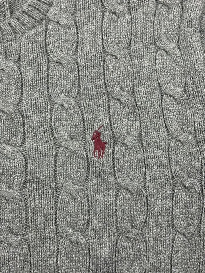 Pull d’hiver torsadé en maille Ralph Lauren gris logo rouge col rond taille L