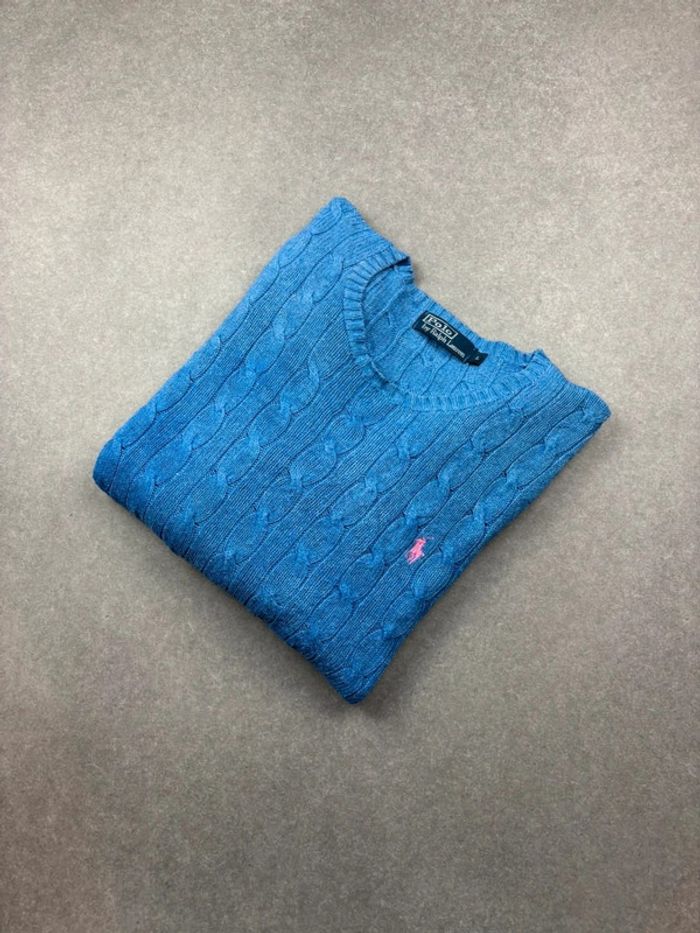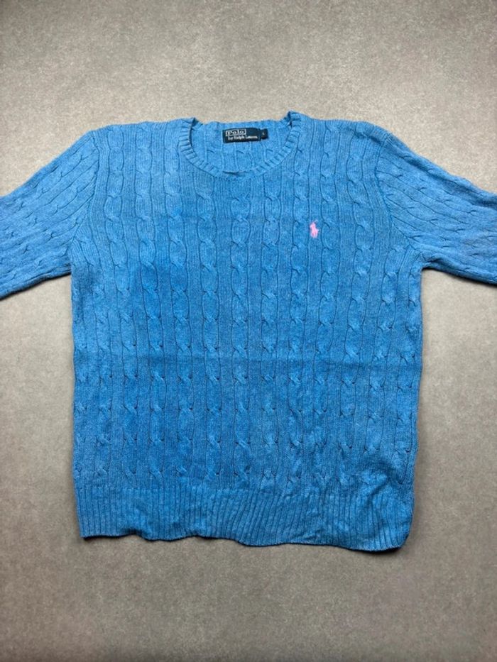 Pull d’hiver torsadé en maille Ralph Lauren bleu col rond taille L - photo numéro 1