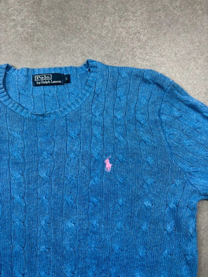 Pull d’hiver torsadé en maille Ralph Lauren bleu col rond taille L - photo numéro 3