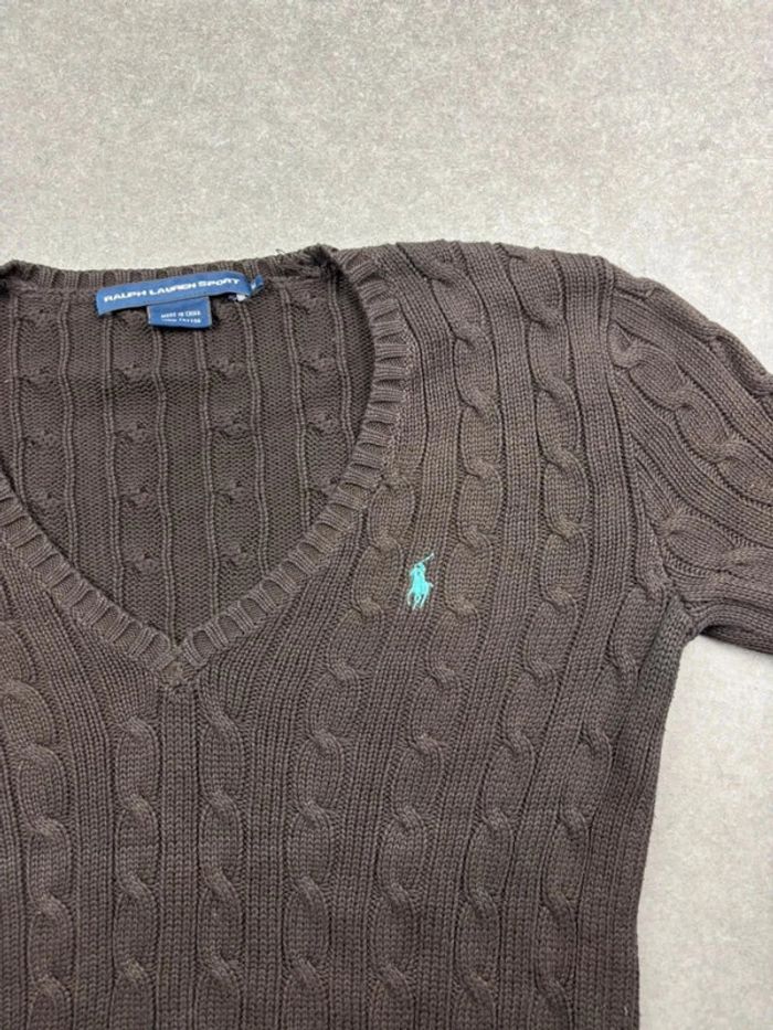 Pull torsadé en maille Ralph Lauren marron logo col V - photo numéro 5