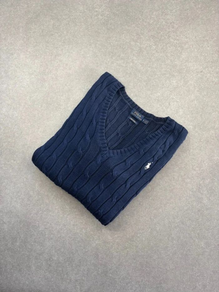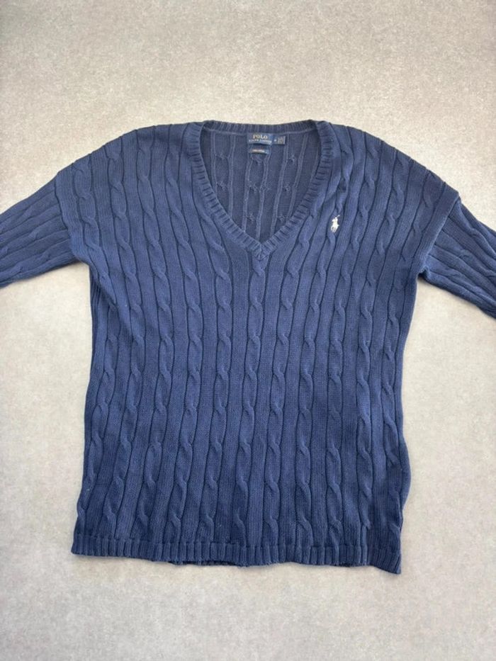 Pull d’hiver torsadé en maille Ralph Lauren bleu marine logo rouge col V taille M femme - photo numéro 1