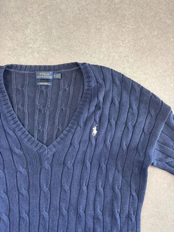 Pull d’hiver torsadé en maille Ralph Lauren bleu marine logo rouge col V taille M femme - photo numéro 3