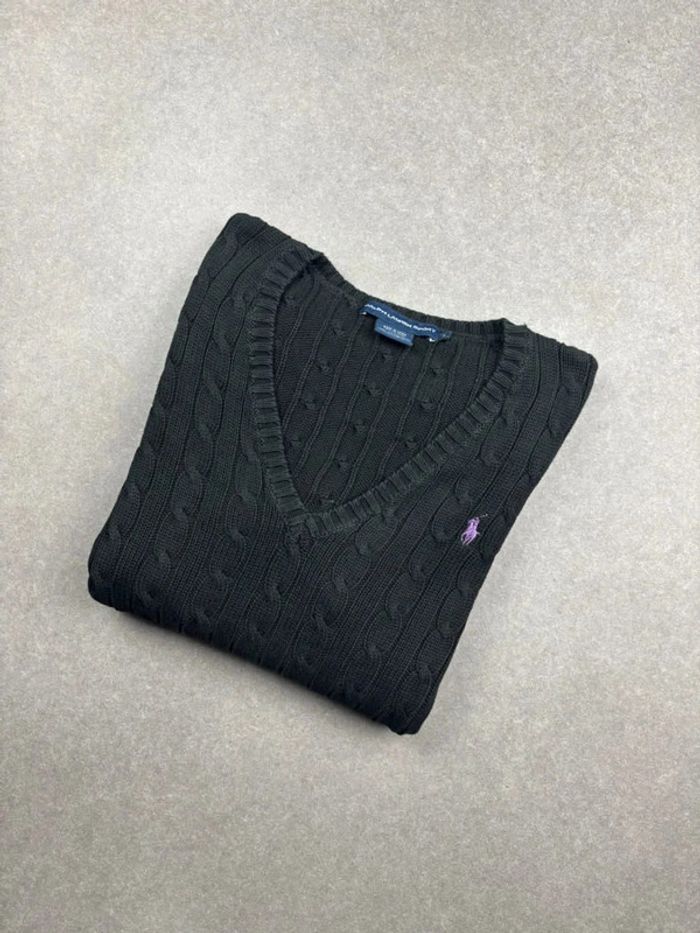 Pull torsadé en maille Ralph Lauren noir logo violet col V - photo numéro 1