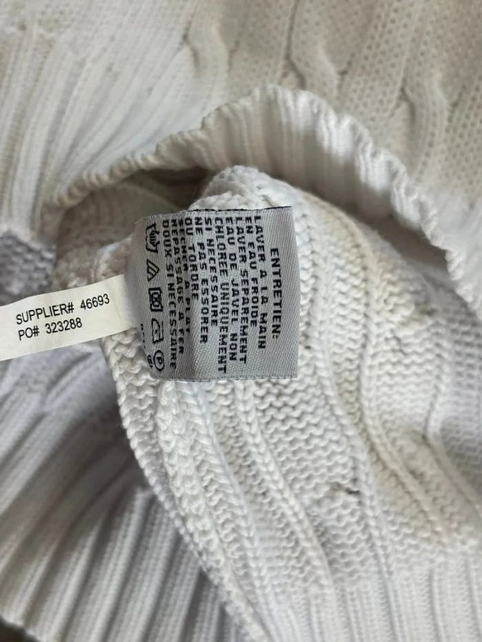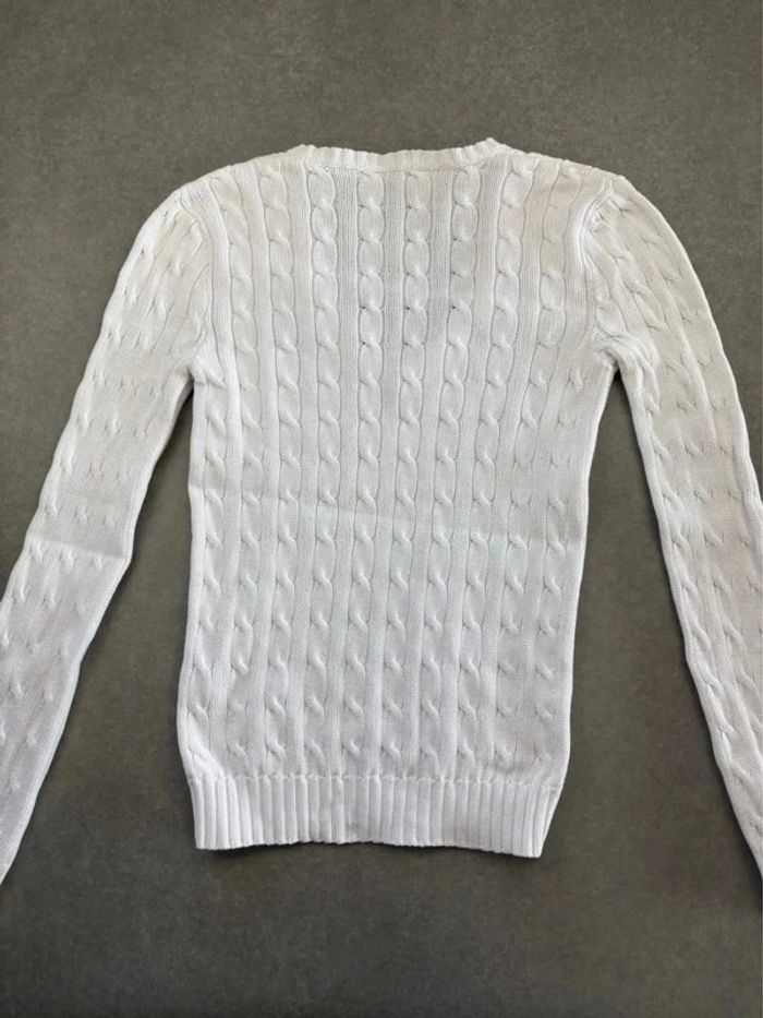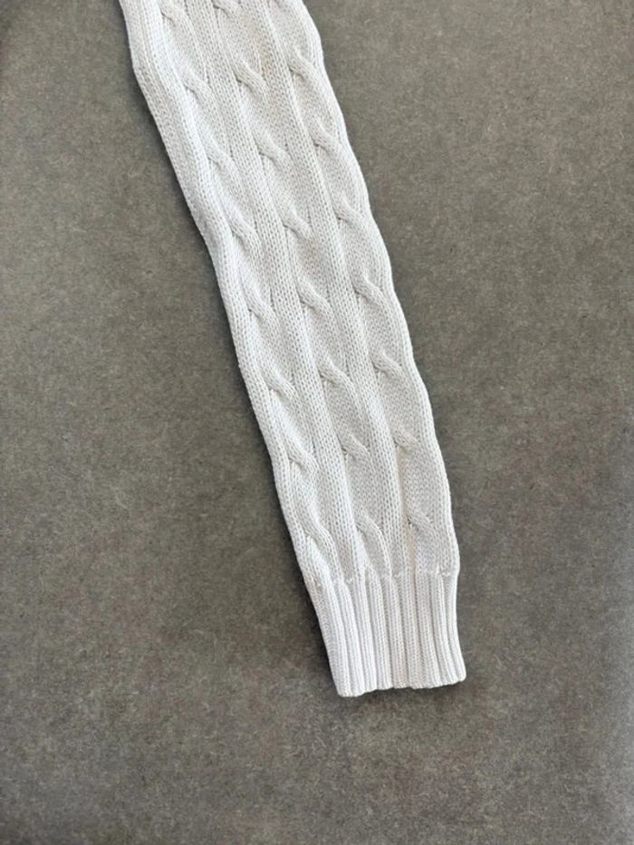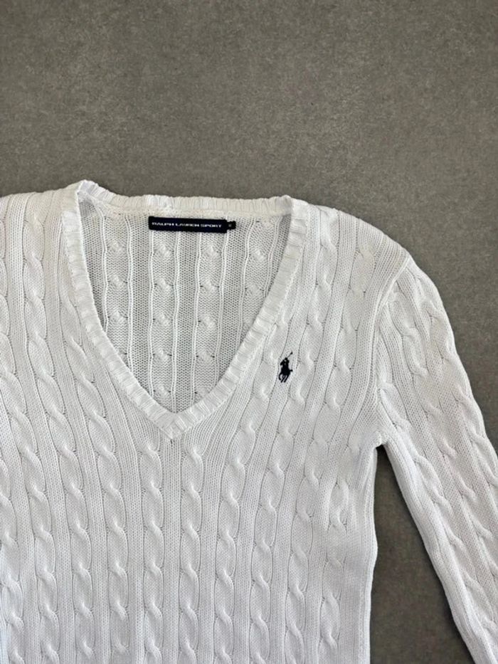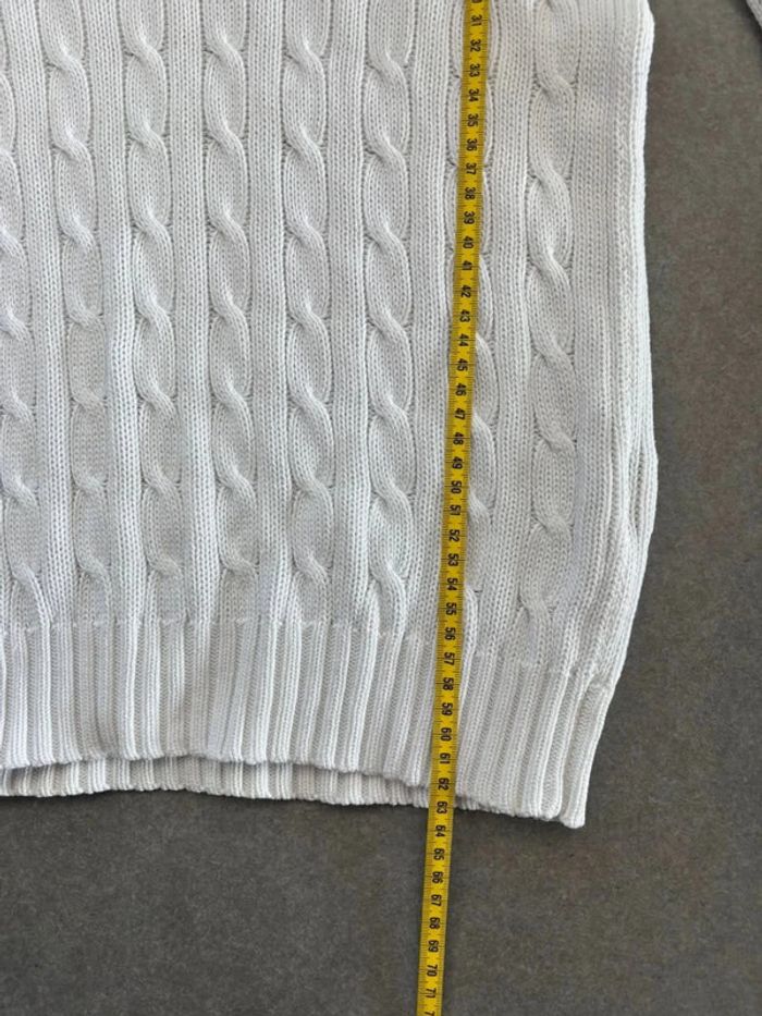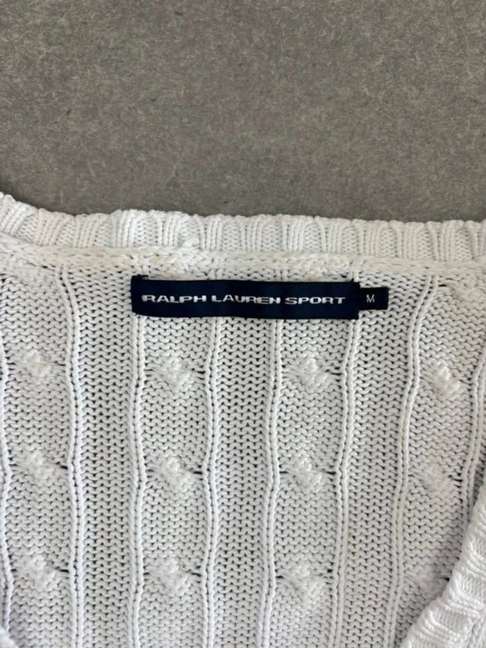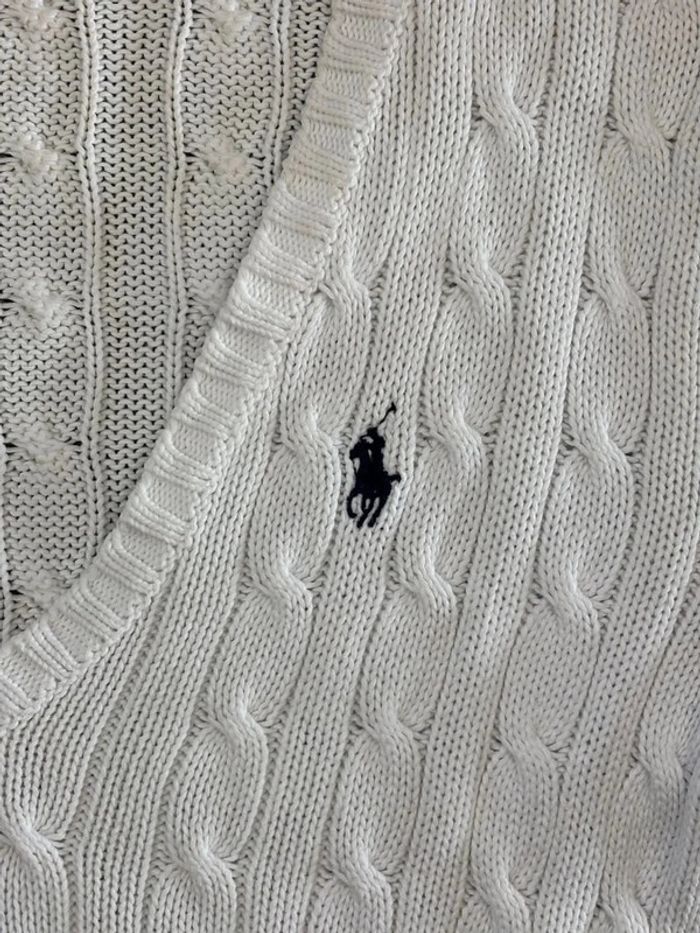 Pull d’hiver torsadé en maille Ralph Lauren blanc logo bleu marine col V taille M femme - photo numéro 11