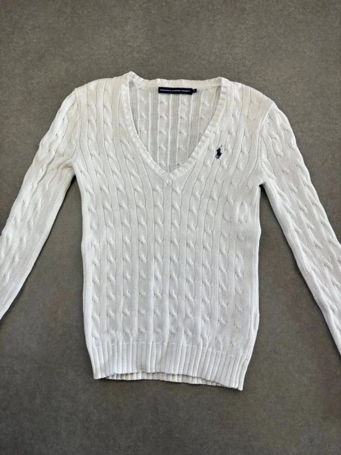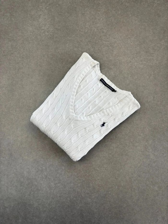 Pull d’hiver torsadé en maille Ralph Lauren blanc logo bleu marine col V taille M femme - photo numéro 1