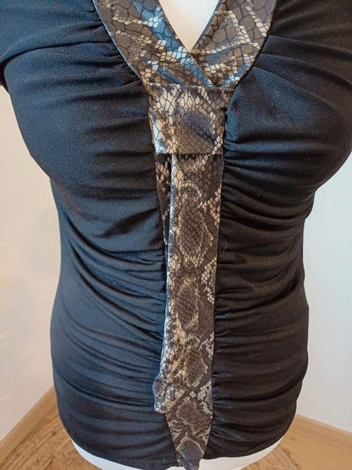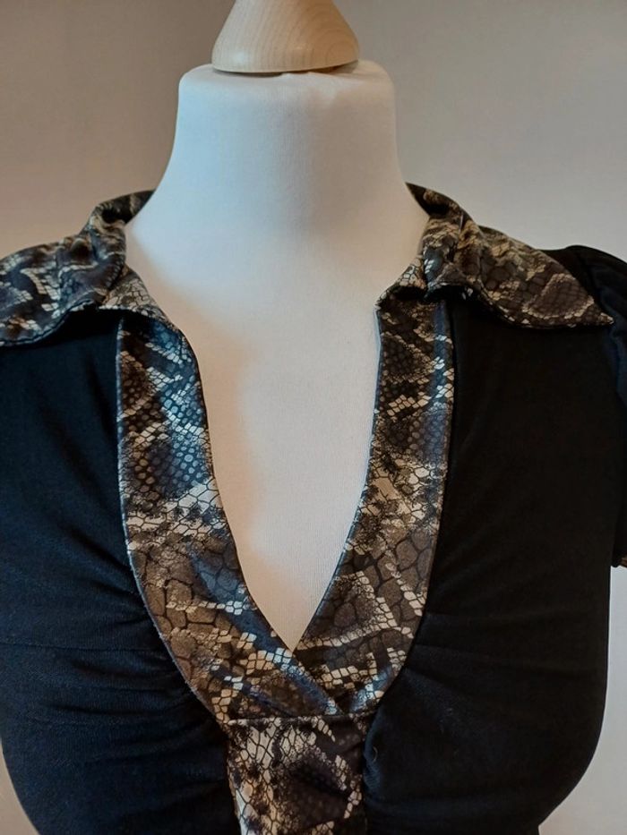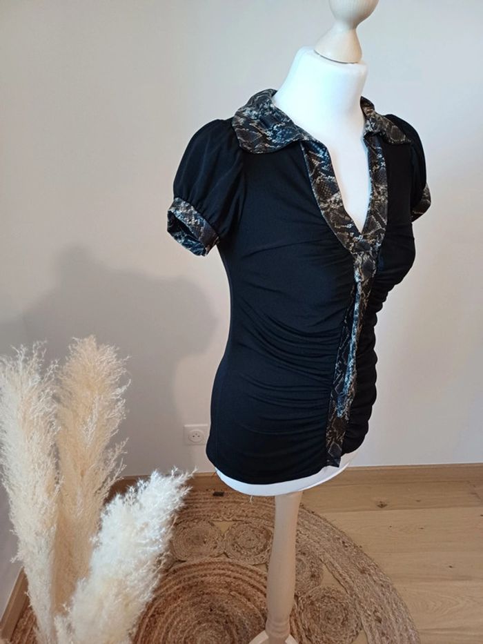Blouse noire froncée Vintage a manches courtes avec col en V et détails imprimé Python taille S 36. Très bon état. Longueur: 60cm Composition: 92% Polyester et 8% Elasthane #paulineragot_femmetailles #paulineragot_hauttailles #imprimépython #imprimeserpent #manchescourtes #MC #colenv #froncé #satiné #blousenoire #Vintage #moulant #presducorps #ajustable #extensible #simple #basic #basique #classic #classique #tendance #vintage #original #glamour #élégant #romantique #bohème #classe #chic #habillé #sortie #soirée #fete #cocktail #ceremonie #événement #misaison #automnehiver #printempsété #entretiendembauche #bureau #workinggirl #sortieentreamis #repasenfamille #dinerenamoureux #glamour #élégant #romantique #boheme #sexy #femmefatale #fetesdefindannée #Noël #saintvalentin #passion