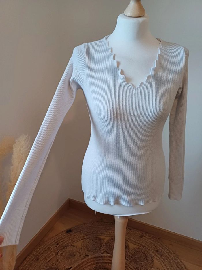 Pull fin blanc côtelé à manches longues avec col en V dentelé taille S 36. État satisfaisant, ⚠️ il a une tâche sur l'épaule, voir photo 6. Longueur: 60cm Composition: 50% Viscose, 28% Polyester et 22% Polyamide. #paulineragot_femmetailles #paulineragot_hauttailles #blanc #mancheslongues #ml #colenv #dentelé #moulant #presducorps #côtelé #simple #basic #basique #classic #classique #tendance #vintage #original #glamour #élégant #romantique #bohème #classe #chic #habillé #sortie #soirée #fete #cocktail #ceremonie #événement #misaison #automnehiver #printempsété #entretiendembauche #bureau #workinggirl #sortieentreamis #repasenfamille #dinerenamoureux #glamour #élégant #romantique #boheme #sexy #femmefatale #fetesdefindannée #Noël #saintvalentin #passion #rétro #jourdelan #réveillon #cadeau #ideedecadeau #cadeaudenoel #nouvelan