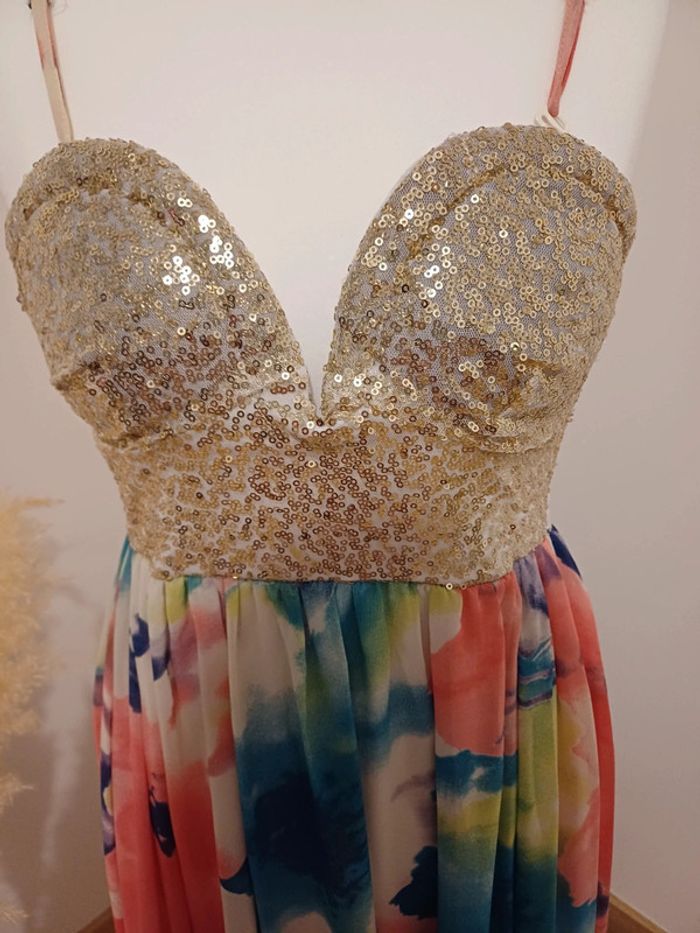 Robe longue doublée colorée à motifs avec Haut en sequins doré, dos nu, fermeture à l'arrière et bretelles réglables amovibles afin de mettre la robe en bustier si souhaité taille S mais qui taille comme un XS 34. Très bon état. Longueur: 145cm Composition: 35% Coton et 65% Polyester. #paulineragot_femmetaillexs #paulineragot_robetaillexs #robelongue #doublée #hautensequins #sequinsdorés #dosnu #smockeaudos #fermetureaudos #zip #bretellesréglables #bretellesajustables #bretellesamovibles #robecolorée #multicolore #fluide #simple #basic #basique #classic #classique #tendance #vintage #original #glamour #élégant #romantique #bohème #classe #chic #habillé #sortie #soirée #fete #cocktail #ceremonie #événement #misaison #automnehiver #printempsété #entretiendembauche #bureau #workinggirl #sortieentreamis #repasenfamille #dinerenamoureux #glamour #élégant #romantique #boheme #sexy #femmefatale #fetesdefindannée #Noël #saintvalentin #passion