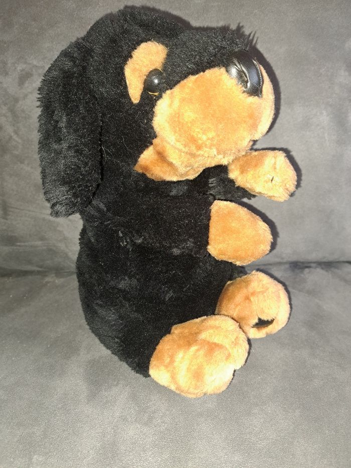 Voici une adorable peluche en forme de chien noir et jaune. Cette peluche est très douce et moelleuse, parfaite pour câliner. Ses grands yeux ronds et son nez en plastique lui donnent un air très mignon et expressif. Idéal pour les enfants, cette peluche mesurant environ 28 cm de hauteur sera un compagnon de jeu parfait pour les petits. Elle est propre. Le systèmede bruitagene fonctionne plus et le cache pile est perdu. C'est donc une belle pièce de collection ou un cadeau idéal pour un enfant qui aimerait avoir un chien en peluche. - Peluche chien noir et jaune - Hauteur d'environ 28 cm - Très douce et moelleuse - Yeux ronds et nez en plastique - Bon état