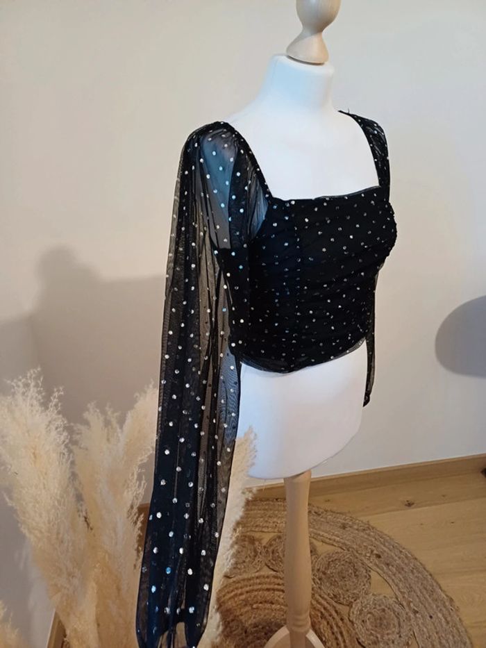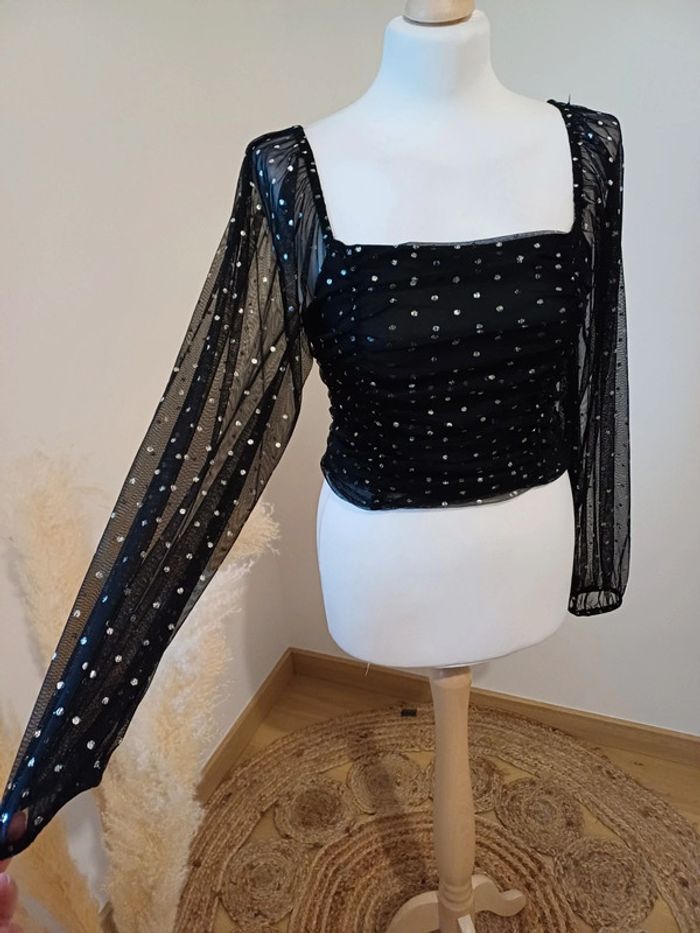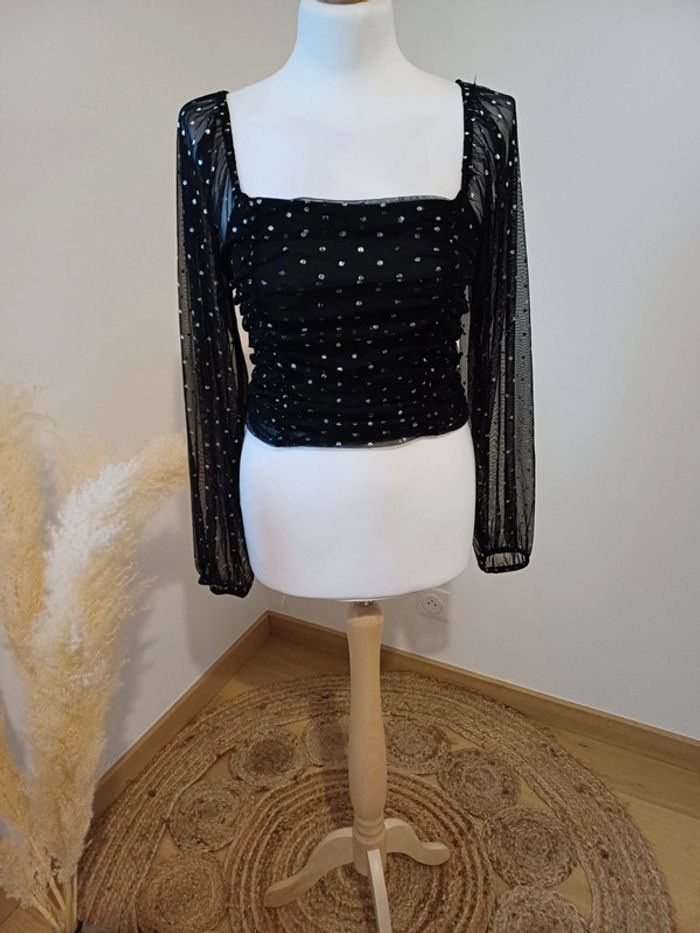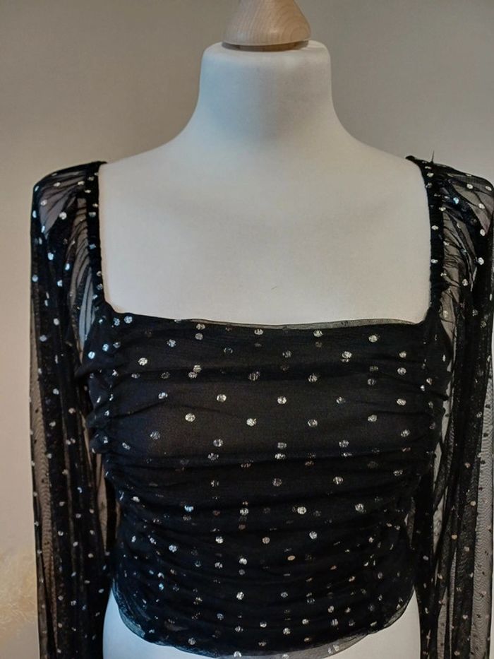 Crop top noir froncé à pois argentés avec manches longues transparentes et col carré marque Clockhouse taille S 36. Très bon état. Longueur: 40cm #paulineragot_femmetailles #paulineragot_hauttailles #clockhouse #clk #mancheslongues #ml #manchestransparentes #resseréauxmanches #topcourt #croptop #poisargentés #fronce #plisse #colcarré #dosnu #simple #basic #basique #classic #classique #tendance #vintage #original #glamour #élégant #romantique #bohème #classe #chic #habillé #sortie #soirée #fete #cocktail #ceremonie #événement #misaison #automnehiver #printempsété #entretiendembauche #bureau #workinggirl #sortieentreamis #repasenfamille #dinerenamoureux #glamour #élégant #romantique #boheme #sexy #femmefatale #fetesdefindannée #Noël #saintvalentin #passion #rétro #jourdelan #réveillon #cadeau #ideedecadeau #cadeaudenoel #nouvelan