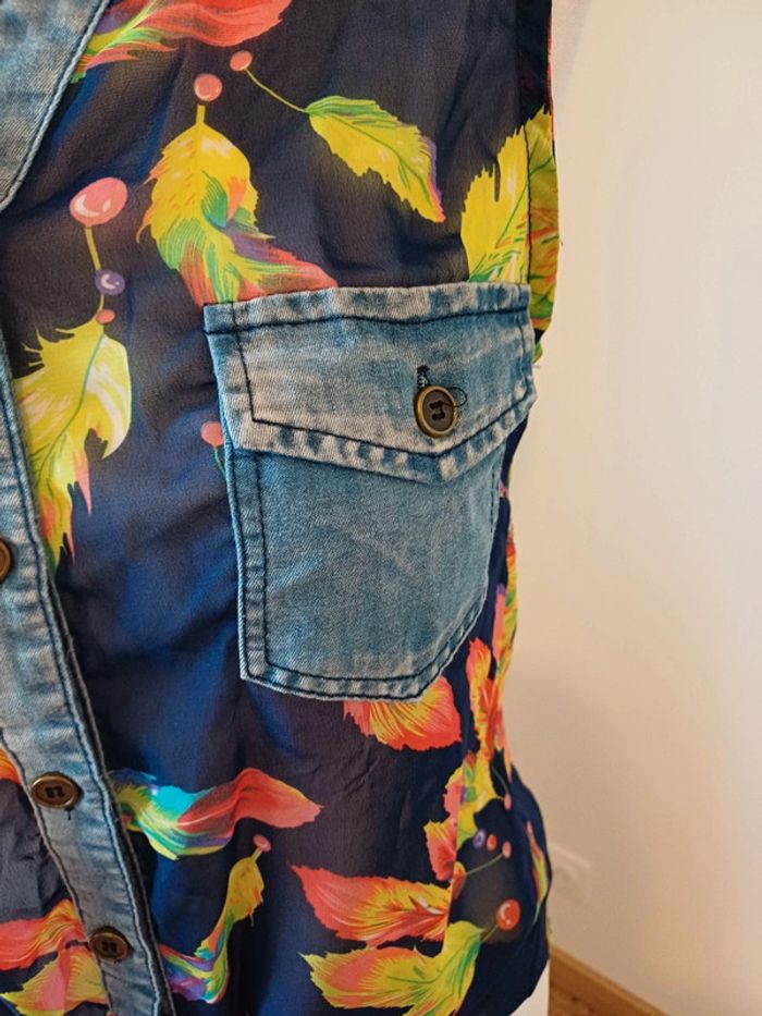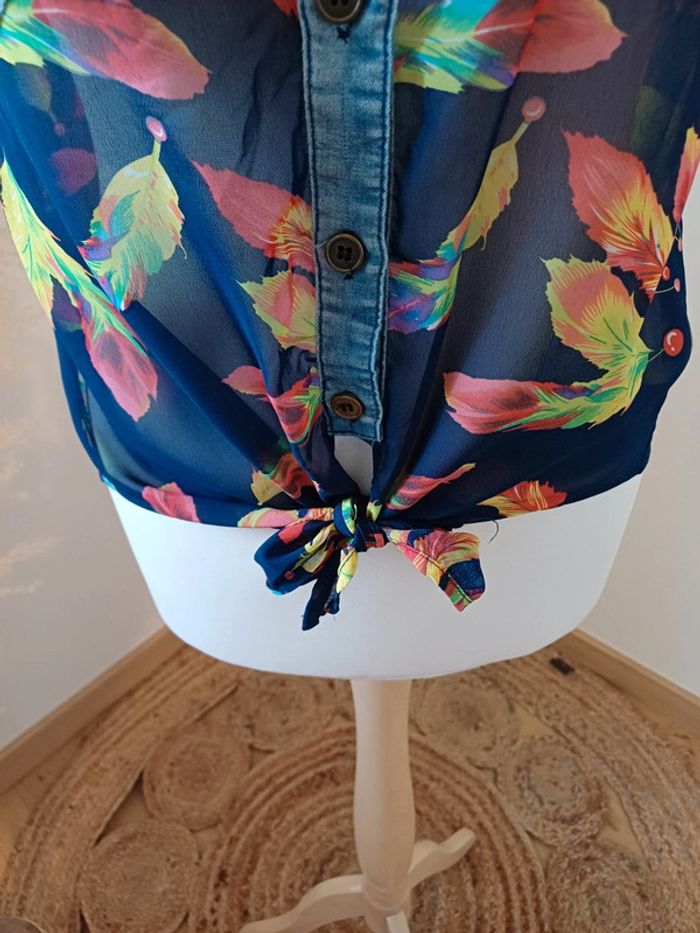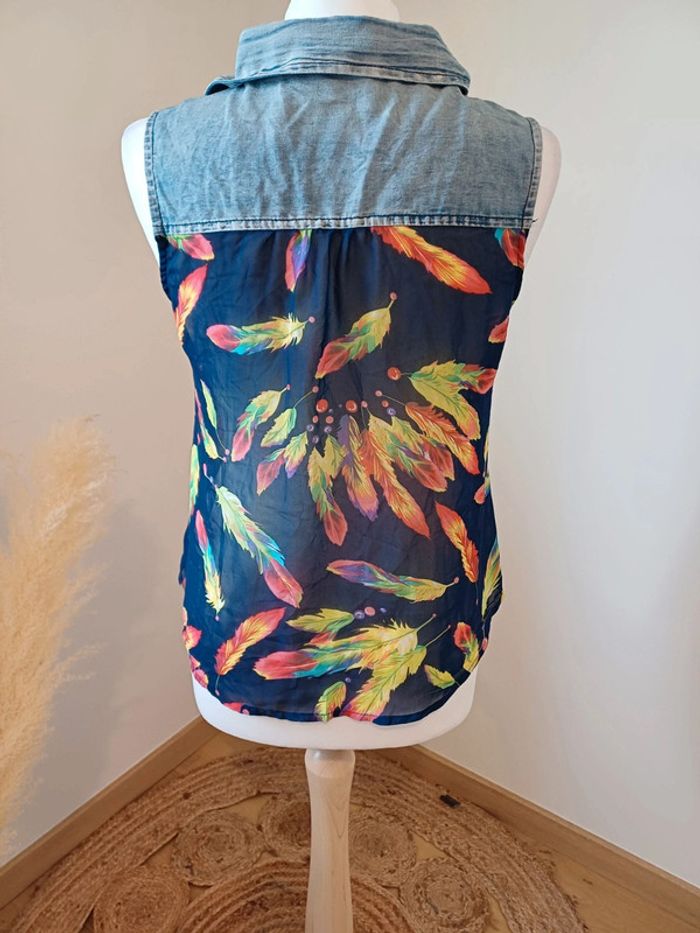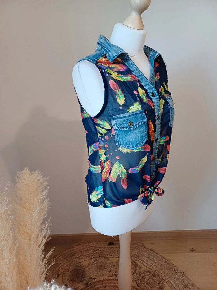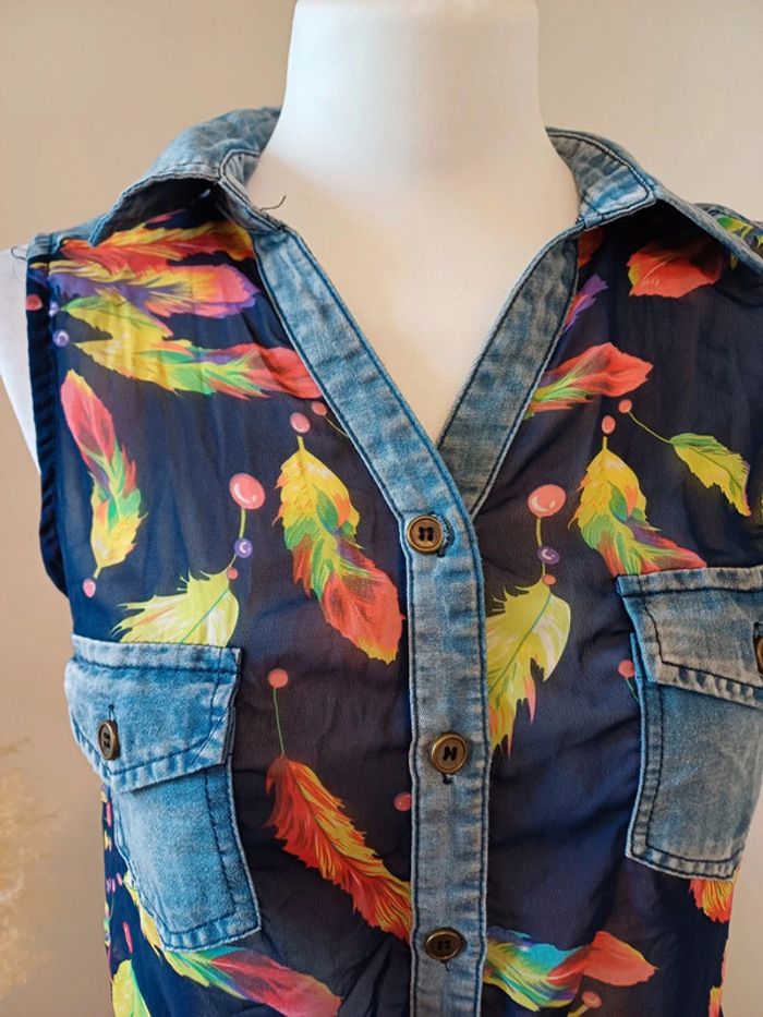 Chemise bi-matière transparente bleue marine boutonnée à motifs plumes sans manches avec poches et noeud en bas marque May & Co taille S 36. Très bon état. Longueur: 55cm Composition: 100% Polyester #paulineragot_femmetailles #paulineragot_hauttailles #mayandco #sansmanches #bleumarine #coloré #multicolore #chemiseboutonnee #boutons #bimatière #poches #Jean #chemiseamotifs #noeudenbas #plumes #simple #basic #basique #classic #classique #tendance #vintage #original #glamour #élégant #romantique #bohème #classe #chic #habillé #sortie #soirée #fete #cocktail #ceremonie #événement #misaison #automnehiver #printempsété #entretiendembauche #bureau #workinggirl #sortieentreamis #repasenfamille #dinerenamoureux #glamour #élégant #romantique #boheme #sexy #femmefatale #fetesdefindannée #Noël #saintvalentin #passion