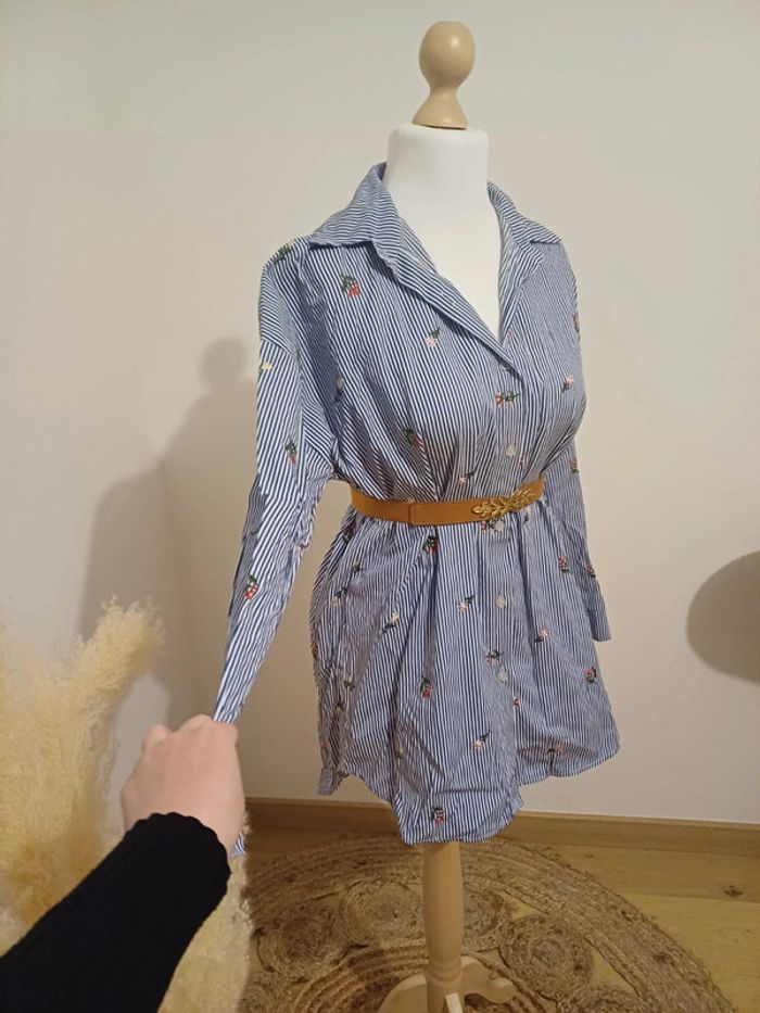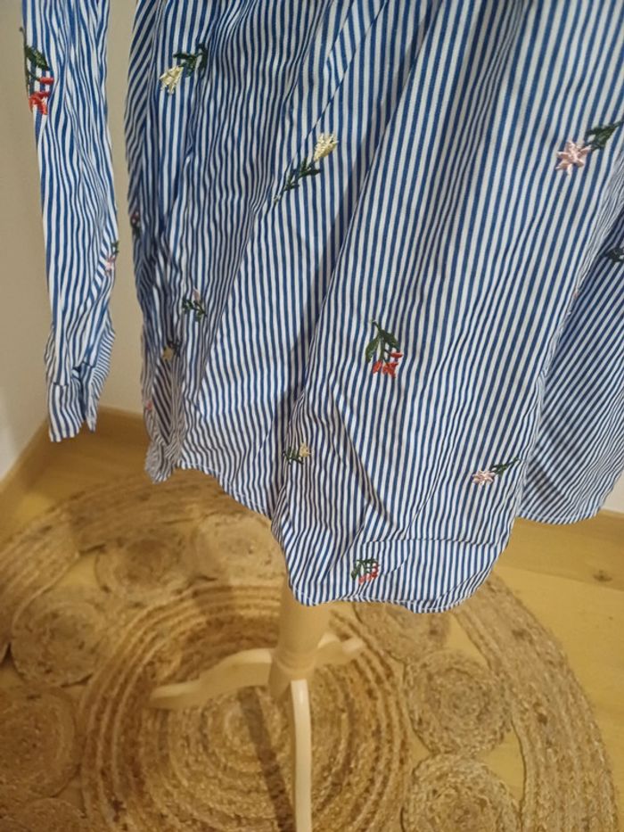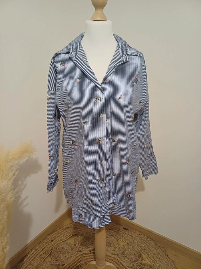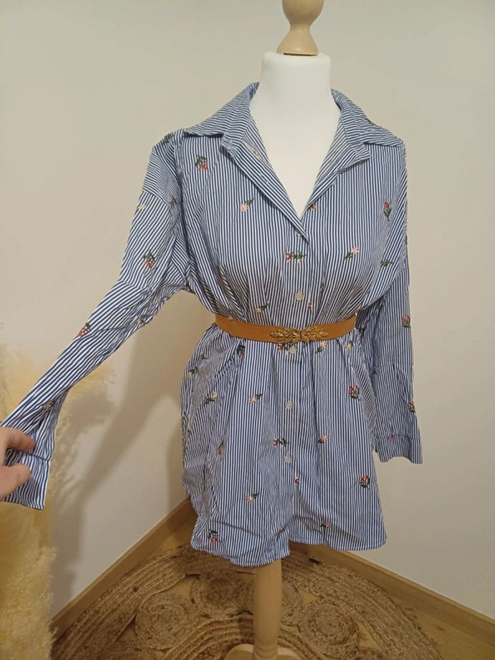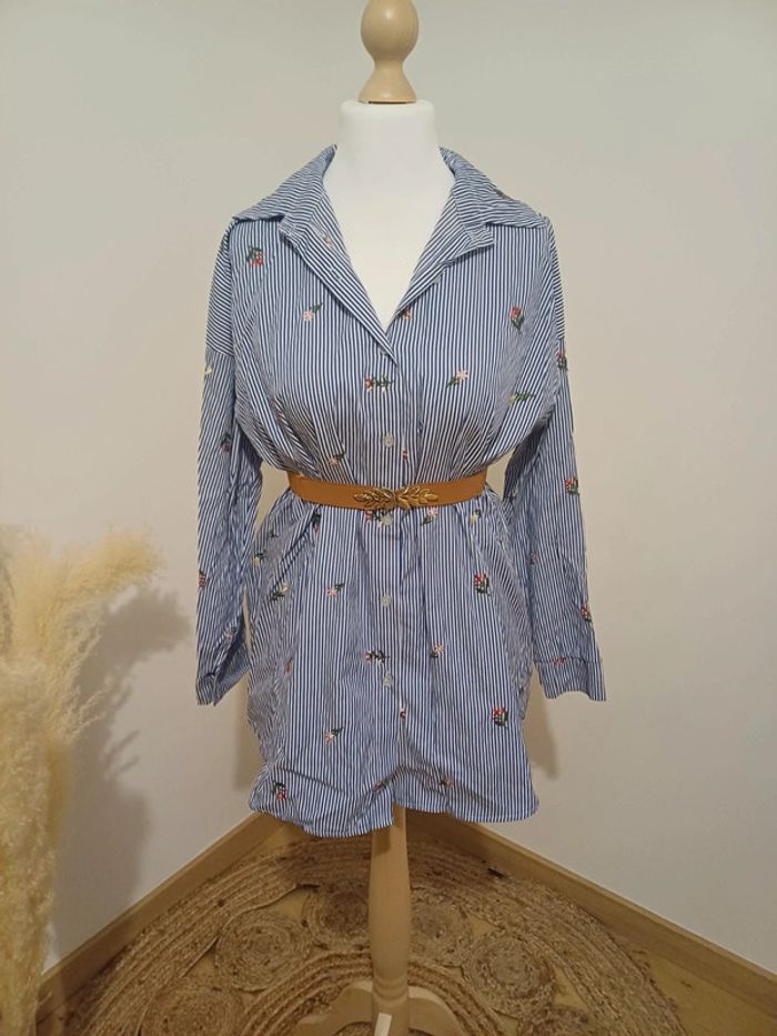 Chemise longue/ mini robe bleue et blanche rayée boutonnée légèrement plus longue derrière que devant avec manches longues et imprimé fleurs brodées marque New Collection taille M/L 38/40. La ceinture n'est pas incluse. Très bon état. Longueur devant: 77cm Longueur derrière: 87cm Composition: 95% Coton et 5% Elasthane #paulineragot_femmetaillem #paulineragot_hauttaillem #paulineragot_robetaillem #paulineragot_femmetaillel #paulineragot_hauttaillel #paulineragot_robetaillel #newcollection #chemise #rayée #fleursbrodées #pluslongderrierequedevant #minirobe #simple #basic #basique #classic #classique #tendance #vintage #original #glamour #élégant #romantique #bohème #classe #chic #habillé #sortie #soirée #fete #cocktail #ceremonie #événement #misaison #automnehiver #printempsété #entretiendembauche #bureau #workinggirl #sortieentreamis #repasenfamille #dinerenamoureux #glamour #élégant #romantique #boheme #sexy #femmefatale #fetesdefindannée #Noël #saintvalentin #passion #rétro #jourdelan #réveillon #cadeau #ideedecadeau #cadeaudenoel #nouvelan