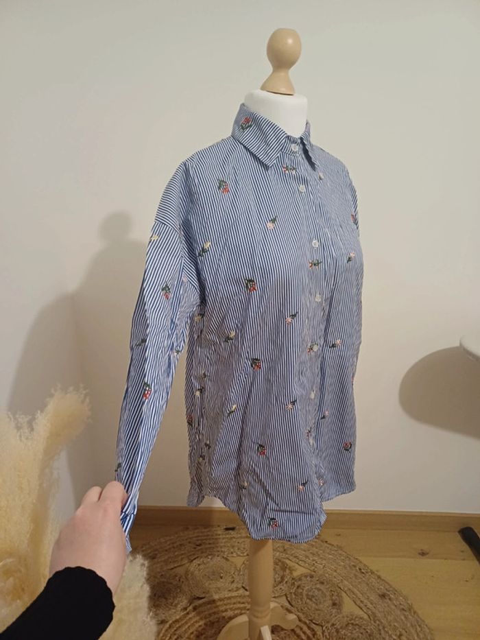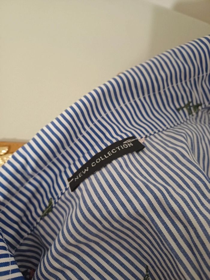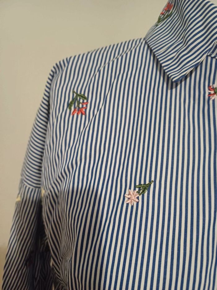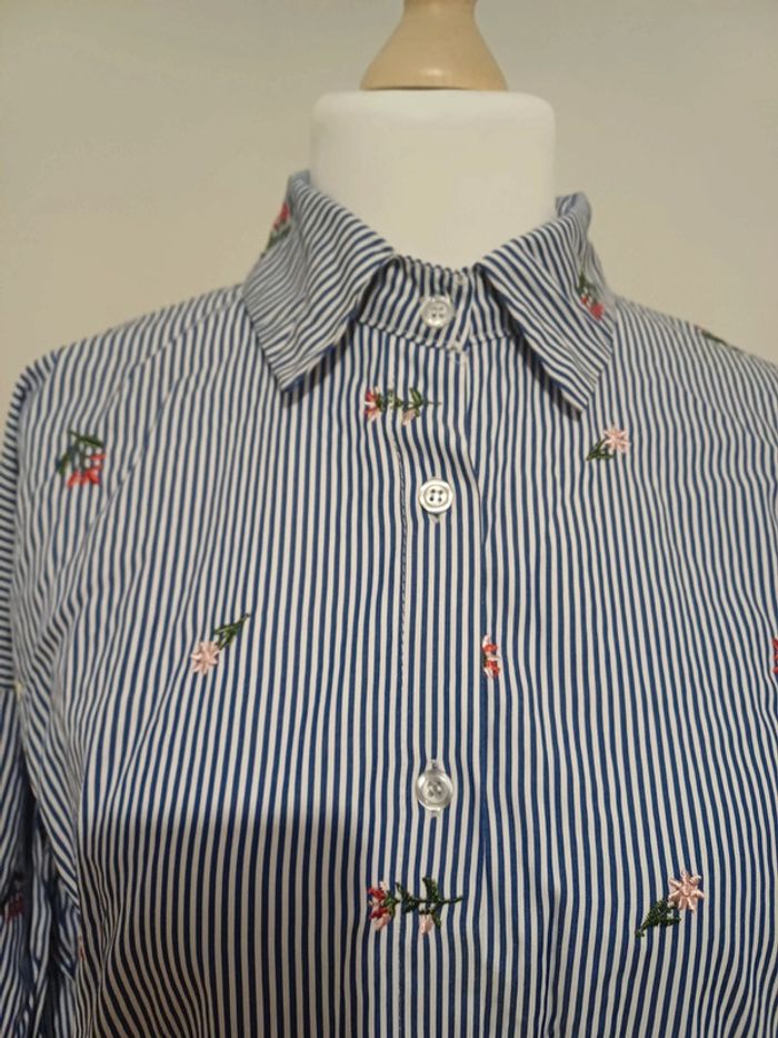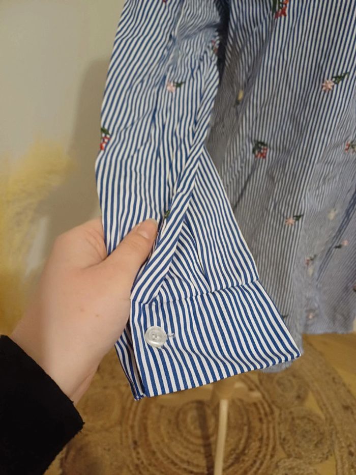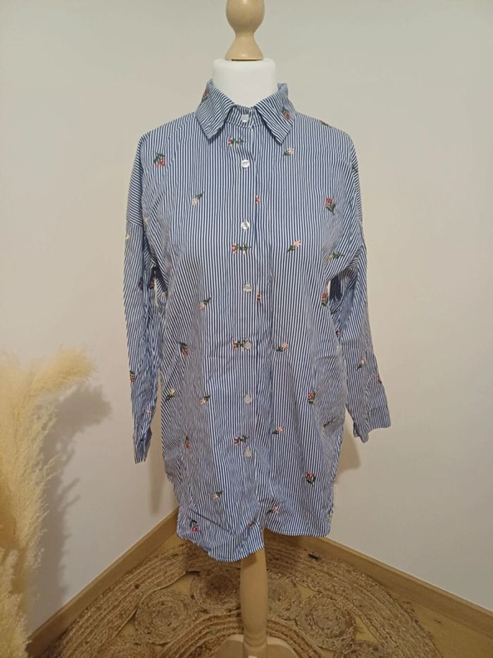 Chemise longue/ mini robe bleue et blanche rayée boutonnée légèrement plus longue derrière que devant avec manches longues et imprimé fleurs brodées marque New Collection taille M/L 38/40. La ceinture n'est pas incluse. Très bon état. Longueur devant: 77cm Longueur derrière: 87cm Composition: 95% Coton et 5% Elasthane #paulineragot_femmetaillem #paulineragot_hauttaillem #paulineragot_robetaillem #paulineragot_femmetaillel #paulineragot_hauttaillel #paulineragot_robetaillel #newcollection #chemise #rayée #fleursbrodées #pluslongderrierequedevant #minirobe #simple #basic #basique #classic #classique #tendance #vintage #original #glamour #élégant #romantique #bohème #classe #chic #habillé #sortie #soirée #fete #cocktail #ceremonie #événement #misaison #automnehiver #printempsété #entretiendembauche #bureau #workinggirl #sortieentreamis #repasenfamille #dinerenamoureux #glamour #élégant #romantique #boheme #sexy #femmefatale #fetesdefindannée #Noël #saintvalentin #passion #rétro #jourdelan #réveillon #cadeau #ideedecadeau #cadeaudenoel #nouvelan