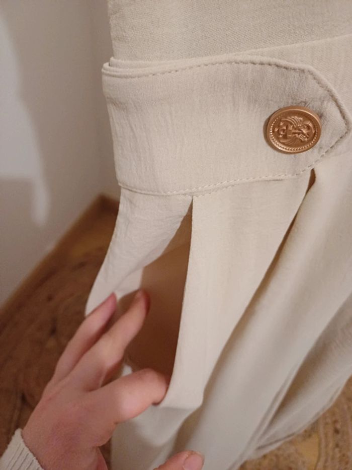 Combinaison beige chic légèrement transparente sans manches extensible avec col en V, épaulettes et poches marque Ikoone & Bianka taille S 36. État satisfaisant, ⚠️ elle est encore neuve et étiquetée mais elle est déchirée sur un côté au niveau de la couture, voir photo 9. Longueur: 135cm Composition: 100% Polyester #paulineragot_femmetailles #paulineragot_combitailles #ikooneetbianka #beige #colenv #boutonsdecoratifs #poches #smock #epaulettes #simple #basic #basique #classic #classique #tendance #vintage #original #glamour #élégant #romantique #bohème #classe #chic #habillé #sortie #soirée #fete #cocktail #ceremonie #événement #misaison #automnehiver #printempsété #entretiendembauche #bureau #workinggirl #sortieentreamis #repasenfamille #dinerenamoureux #glamour #élégant #romantique #boheme #sexy #femmefatale #fetesdefindannée #Noël #saintvalentin #passion #rétro #jourdelan #réveillon #cadeau #ideedecadeau #cadeaudenoel #nouvelan