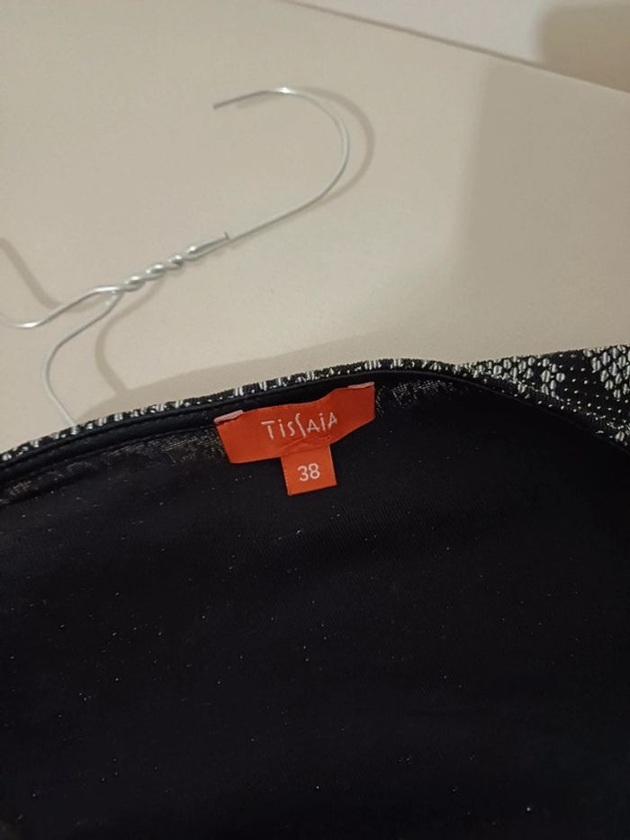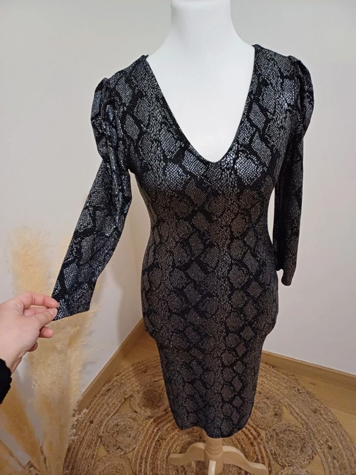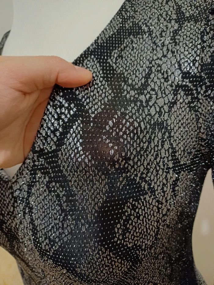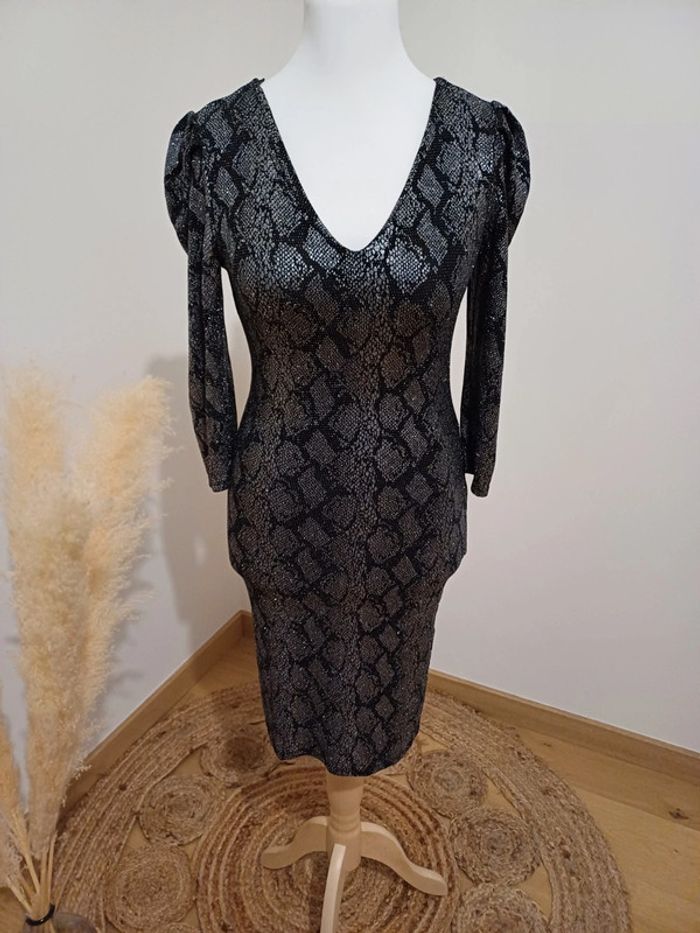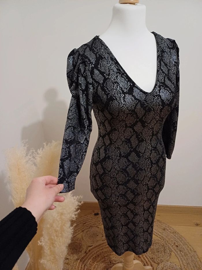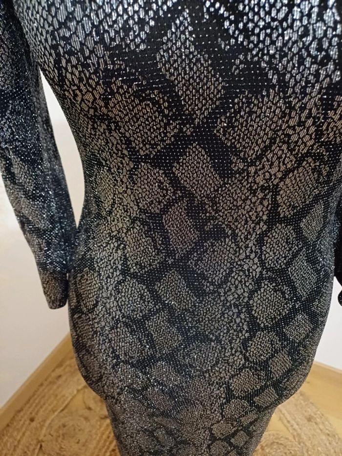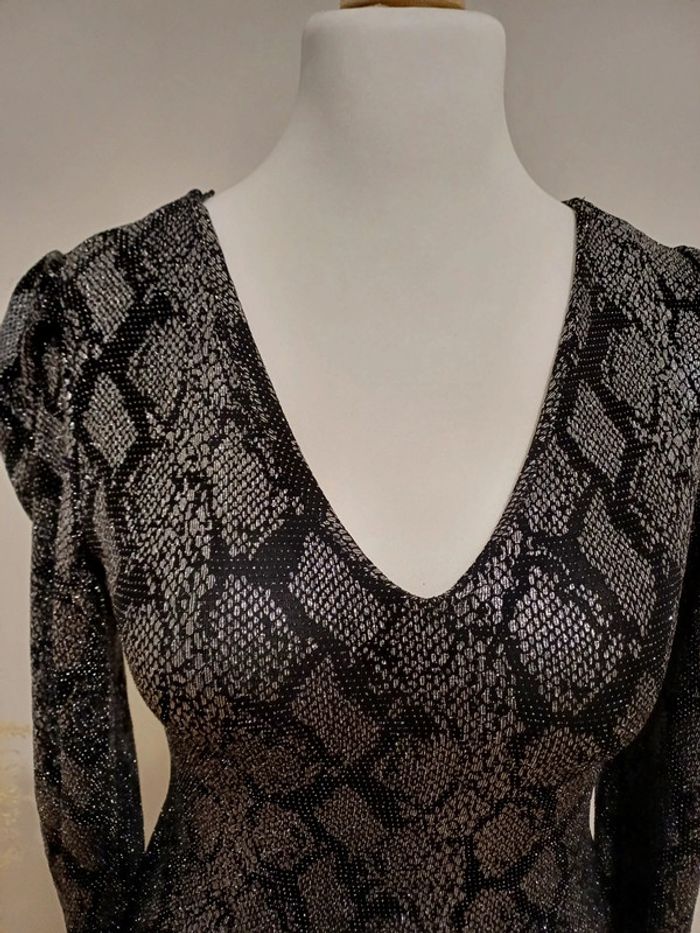 Robe chic pailletée légère pas mal transparente à manches trois quarts avec col en V et imprimé Serpent argenté marque Tissaia taille M 38. Fabriqué en France. Très bon état. Longueur: 95cm Composition: 93% Polyamide, 4% Elasthane et 3% Fibre métallisée. #paulineragot_femmetaillem #paulineragot_robetaillem #tissaia #manchestroisquarts #noiretargenté #légère #fluide #moulante #presducorps #pailletes #colenv #imprimeserpent #simple #basic #basique #classic #classique #tendance #vintage #original #glamour #élégant #romantique #bohème #classe #chic #habillé #sortie #soirée #fete #cocktail #ceremonie #événement #misaison #automnehiver #printempsété #entretiendembauche #bureau #workinggirl #sortieentreamis #repasenfamille #dinerenamoureux #glamour #élégant #romantique #boheme #sexy #femmefatale #fetesdefindannée #Noël #saintvalentin #passion #rétro #jourdelan #réveillon #cadeau #ideedecadeau #cadeaudenoel #nouvelan