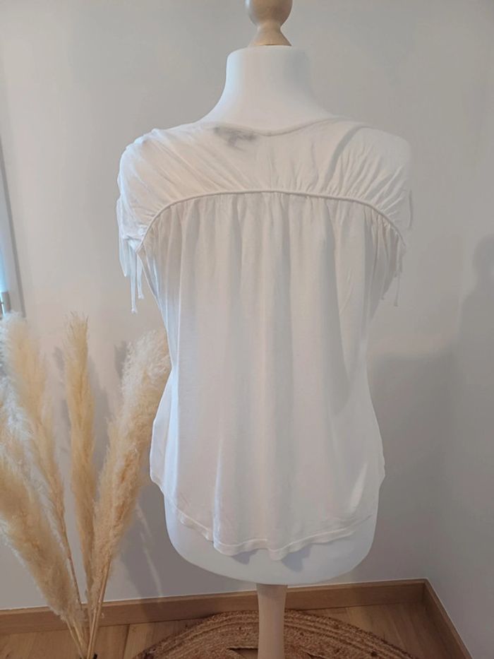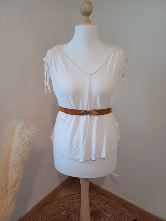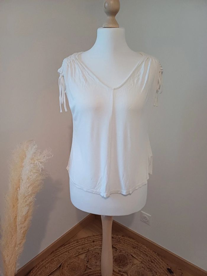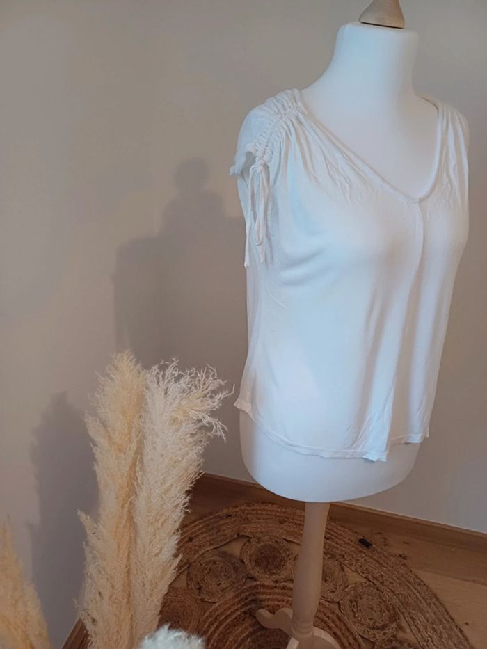 Blouse blanche pas mal transparente sans manches avec liens à nouer sur les épaules et col en V marque Bonobo taille M mais qui taille comme un L 40. La ceinture n'est pas incluse. Très bon état. Longueur: 55cm Composition: 70% Viscose et 30% Lin. #paulineragot_femmetaillel #paulineragot_hauttaillel #bonobo #sansmanches #topblanc #blouse #liensanouer #noeud #colenv #transparent #simple #basic #basique #classic #classique #tendance #vintage #original #glamour #élégant #romantique #bohème #classe #chic #habillé #sortie #soirée #fete #cocktail #ceremonie #événement #misaison #automnehiver #printempsété #entretiendembauche #bureau #workinggirl #sortieentreamis #repasenfamille #dinerenamoureux #glamour #élégant #romantique #boheme #sexy #femmefatale #fetesdefindannée #Noël #saintvalentin #passion