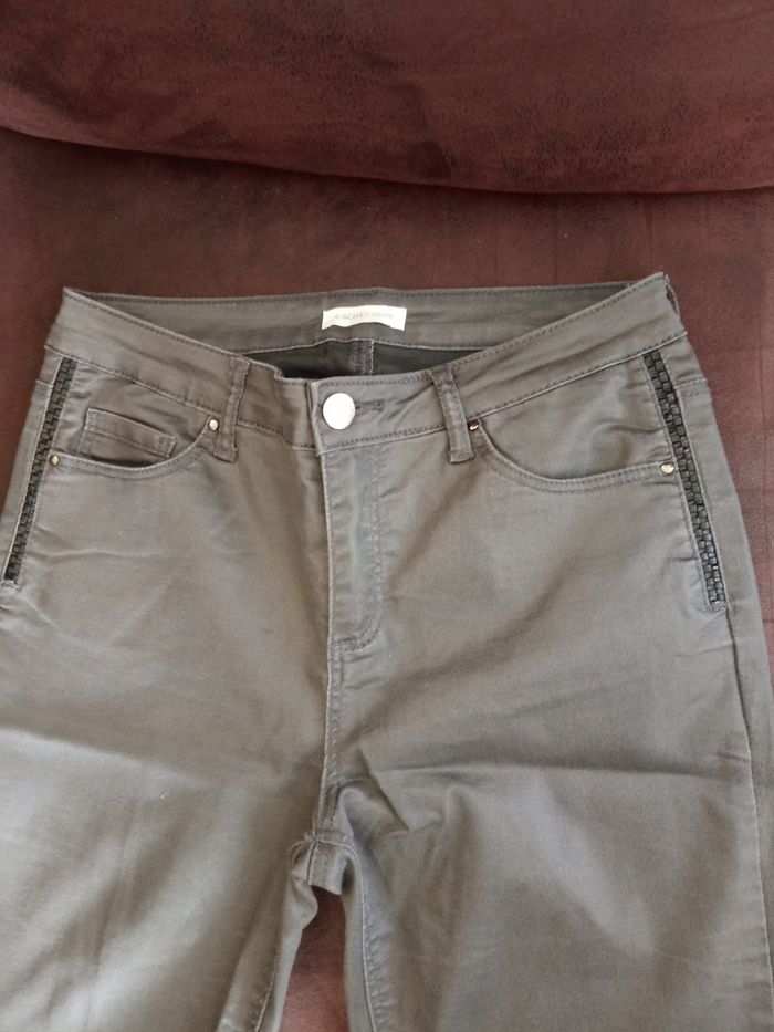 Joli Pantalon T38 "Cache Cache" Couleur: Gris uni Taille non élastiquée, passants tout autour de la taille Fermé devant par 1 bouton et fermeture éclair Poches devant et derrière Dimensions: Longueur 102cm- Entrejambes 74,5cm - Taille non étirée 37cm - Hanches 45cm Matière: Coton + Polyester + Elasthanne Pantalon comme Neuf, porté 1 fois (vendu comme sur les photos)