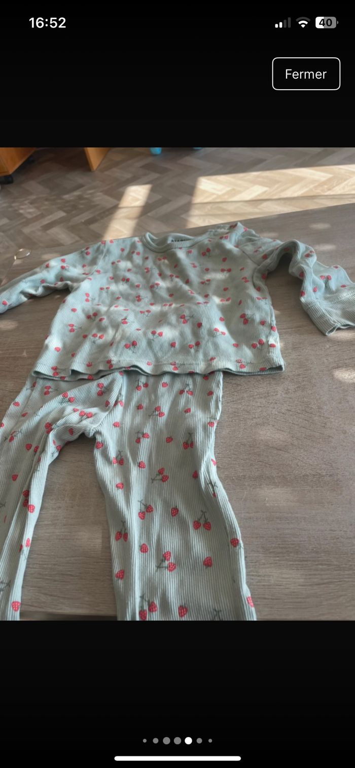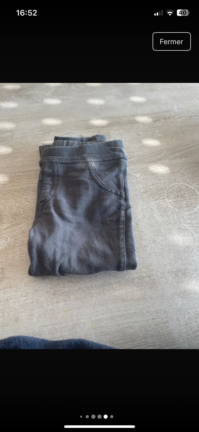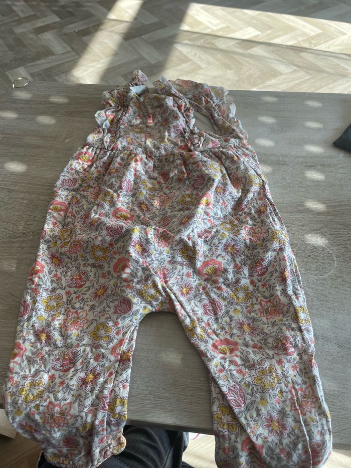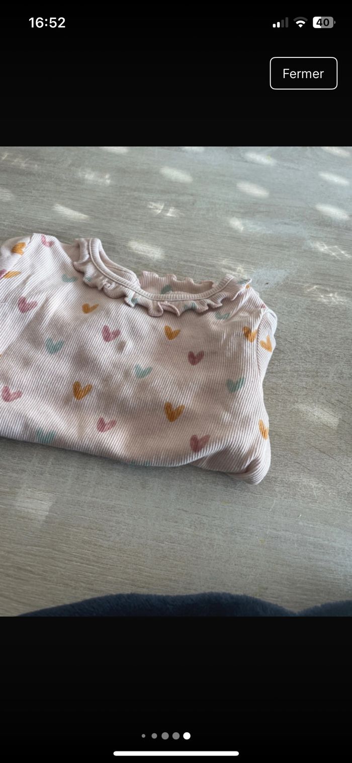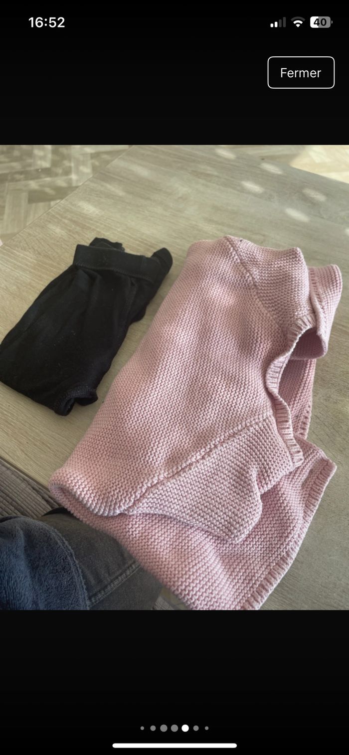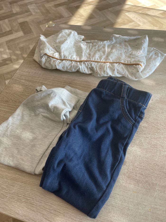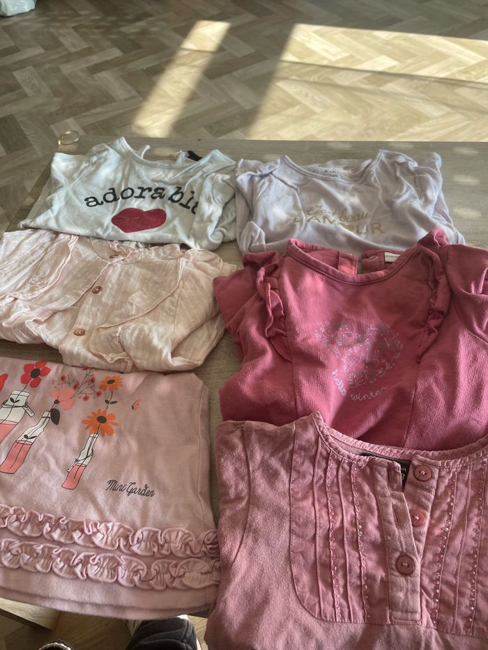 14 hauts (pull minie et chemisier à pois sur la troisième photos légèrement tachés au niveau des manches) 1 combinaison 4 leggings 1 gilet 1 pyjama Le reste en très bon état