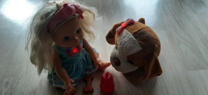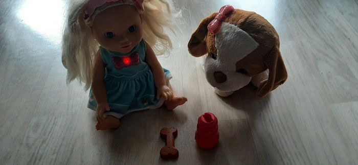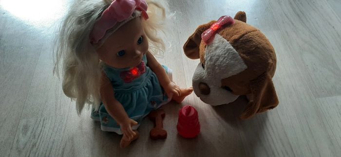 Poupée qui interagit avec son chien Le chien bouge et détecte la présence de la poupée Le chien et la poupée interagissent entre les deux et seuls Ce modèle développe la sensibilité des enfants et active leurs différents sens Comprend différentes chansons