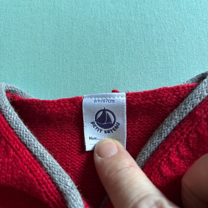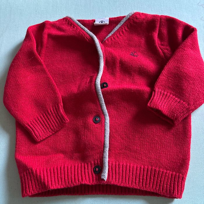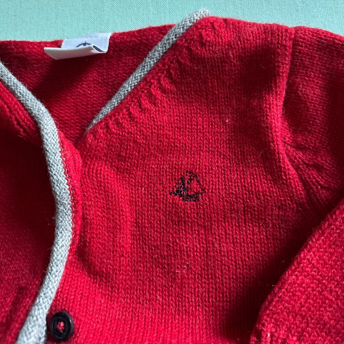 Vends très joli gilet de marque petit bateau taille 6 mois en très bon état Il est rouge avec contours gris 76 pour cent coton et 24 pour cent laine