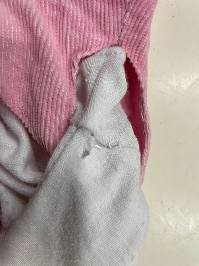 Quelques défauts : - Couleur un peu passée sur la bas - Début de bouloche sur la partie blanche - 1 trou sous le bras