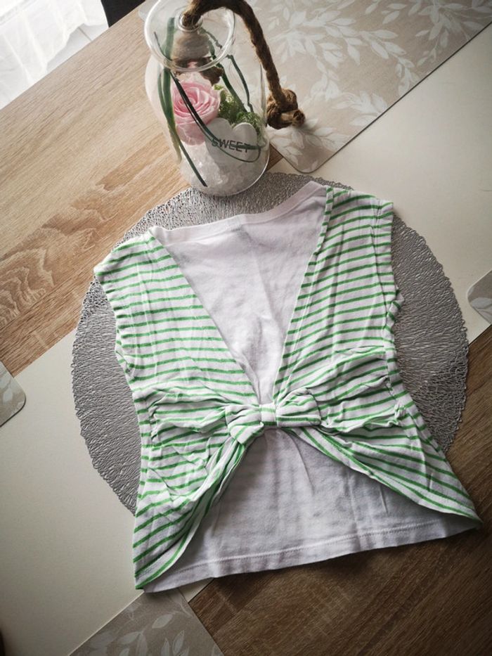 Joli tee shirt Benetton avec noeud dans le dos Très bon état Couleur blanc et vert Réduction sur lot Envoie rapide et soigné