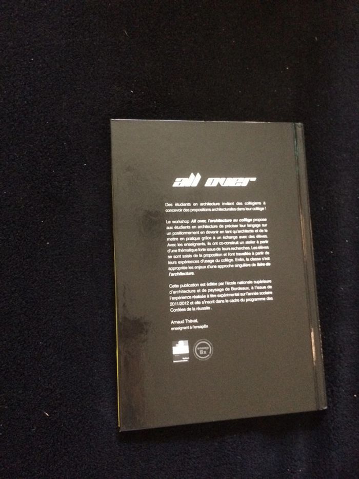 Neuf, jamais lu édité par l'école nationale supérieure d'architecture et de paysage de Bordeaux "Des étudiants en architecture invitent des collégiens à concevoir des propositions architecturales dans leur collège ! Le workshop All over, l’architecture au collège propose aux étudiants en architecture de préciser leur langage sur un positionnement en devenir en tant qu’architecte et de le mettre en pratique grâce à un échange avec des élèves. Avec les enseignants, ils ont co-construit un atelier à partir d’une thématique forte issue de leurs recherches. Les élèves se sont saisis de la proposition et l’ont travaillée à partir de leurs expériences d’usage du collège. Enfin, la classe s’est appropriée les enjeux d’une approche singulière de faire de l’architecture. Cette publication est éditée par l’école nationale supérieure d’architecture et de paysage de Bordeaux, à l’issue de l’expérience réalisée à titre expérimental sur l’année scolaire 2011/2012 et elle s’inscrit dans le cadre du programme des " Cordées de la réussite "."