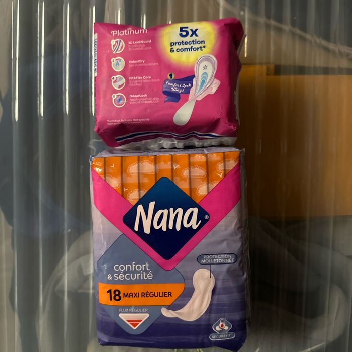 Lot neuf composé d’un paquet de serviettes Nana Maxi régulier (18 pièces) et d’un paquet d’Always Platinum taille 3 (8 pièces)