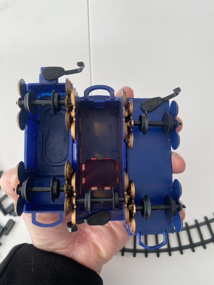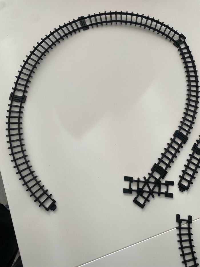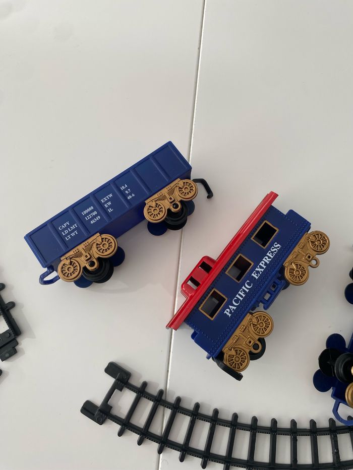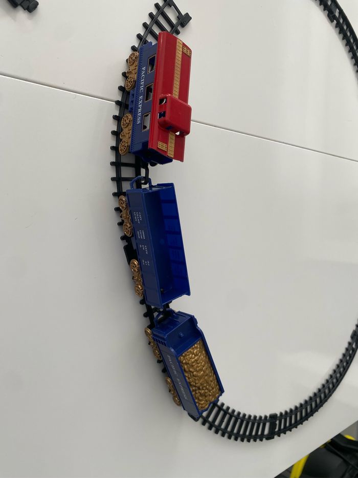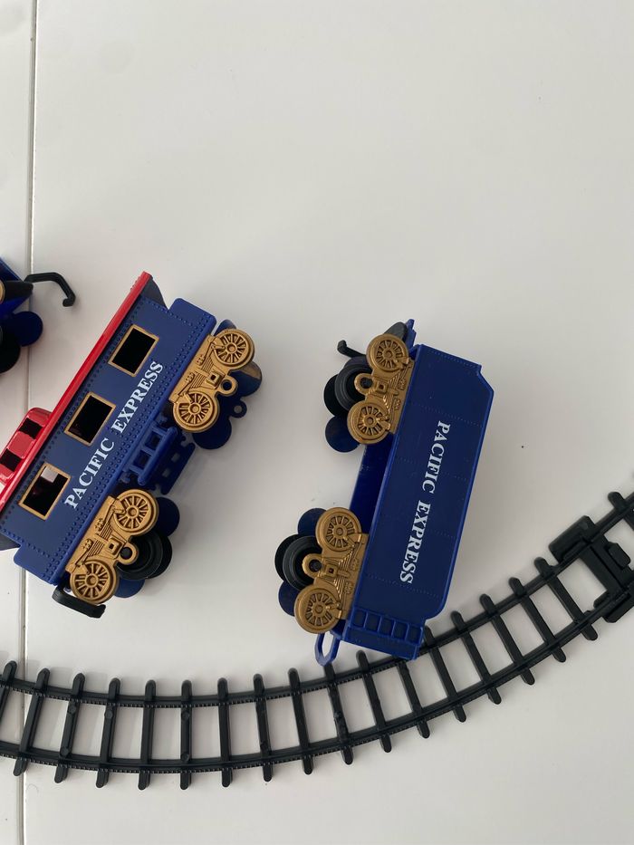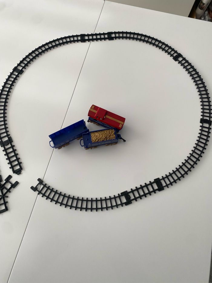 Petit circuit avec une locomotive et deux wagons , n’a jamais servi . 4€