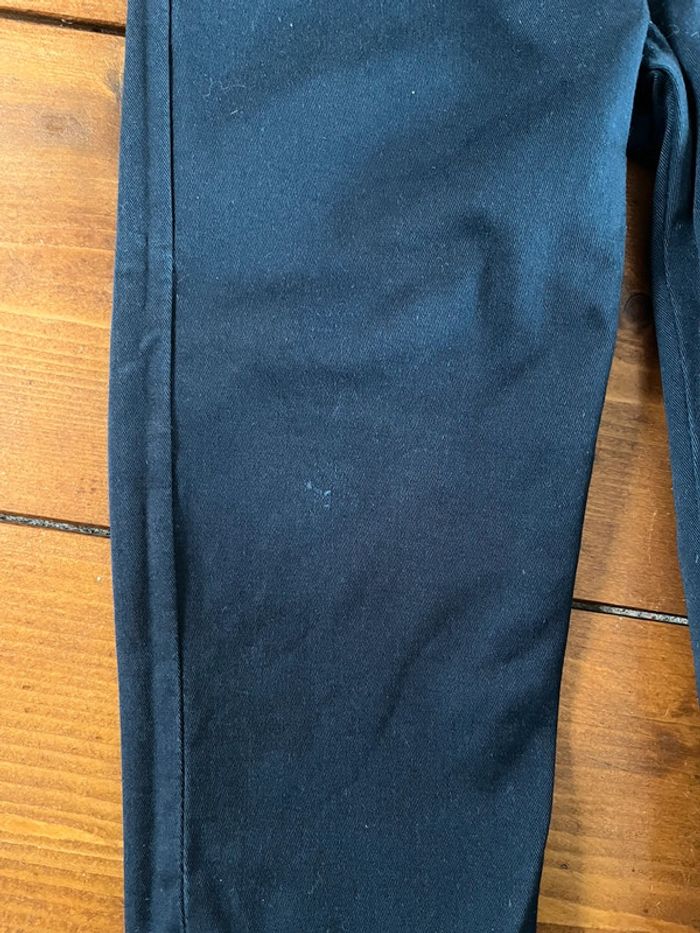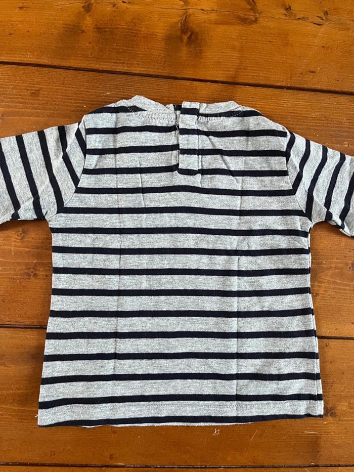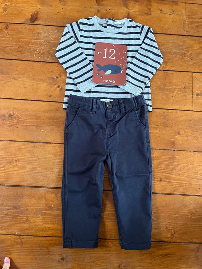 Tee shirt rayé bleu marine et gris style marinière bien porté mais reste en très bon état Pantalon chino bleu marine porte 1 fois pour un mariage donc très bon état à part 1 accro très peu visible visible(voir dernière photo) pas de trou Marque MANGO Taille 12-18 mois (86 cm)